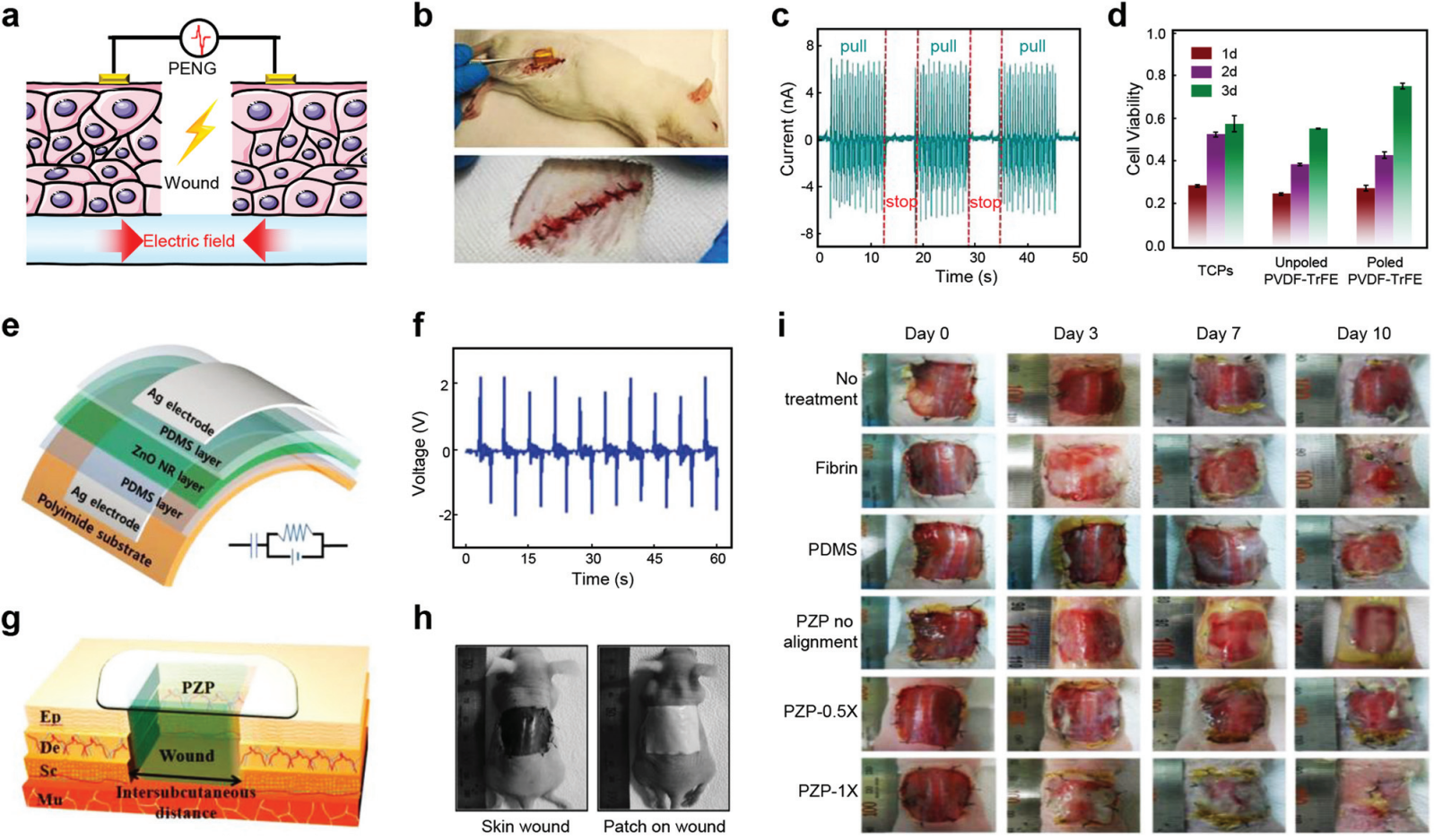 图 16 用于伤口愈合的 PENG。 (a) 在内源电场下引发的伤口愈合机制示意图。(b) 电纺 P(VDF-TrFE) 纳米纤维支架植入大鼠皮下大腿区域(上)和缝合后植入部位(下)的图像。(c) 间歇拉动植入支架的电流输出。(d) L929 成纤维细胞在激发的组织培养聚苯乙烯上增殖的条形图。(e) 用 Ag 电极修饰的 PZP 的示意图,以测量机械弯曲产生的压电电压和电流密度。(f) 通过机械弯曲对 ZnO NR 单层产生的压电电压进行量化。 (g) 皮下距离测量的伤口部位示意图。(h) 小鼠背部皮肤伤口的照片(左),以及通过在 PZP 上覆盖透明薄膜将九层 PZP 放置在伤口上(右)。(i) 治疗后 0、3、7 和 10 天的代表性皮肤伤口照片。