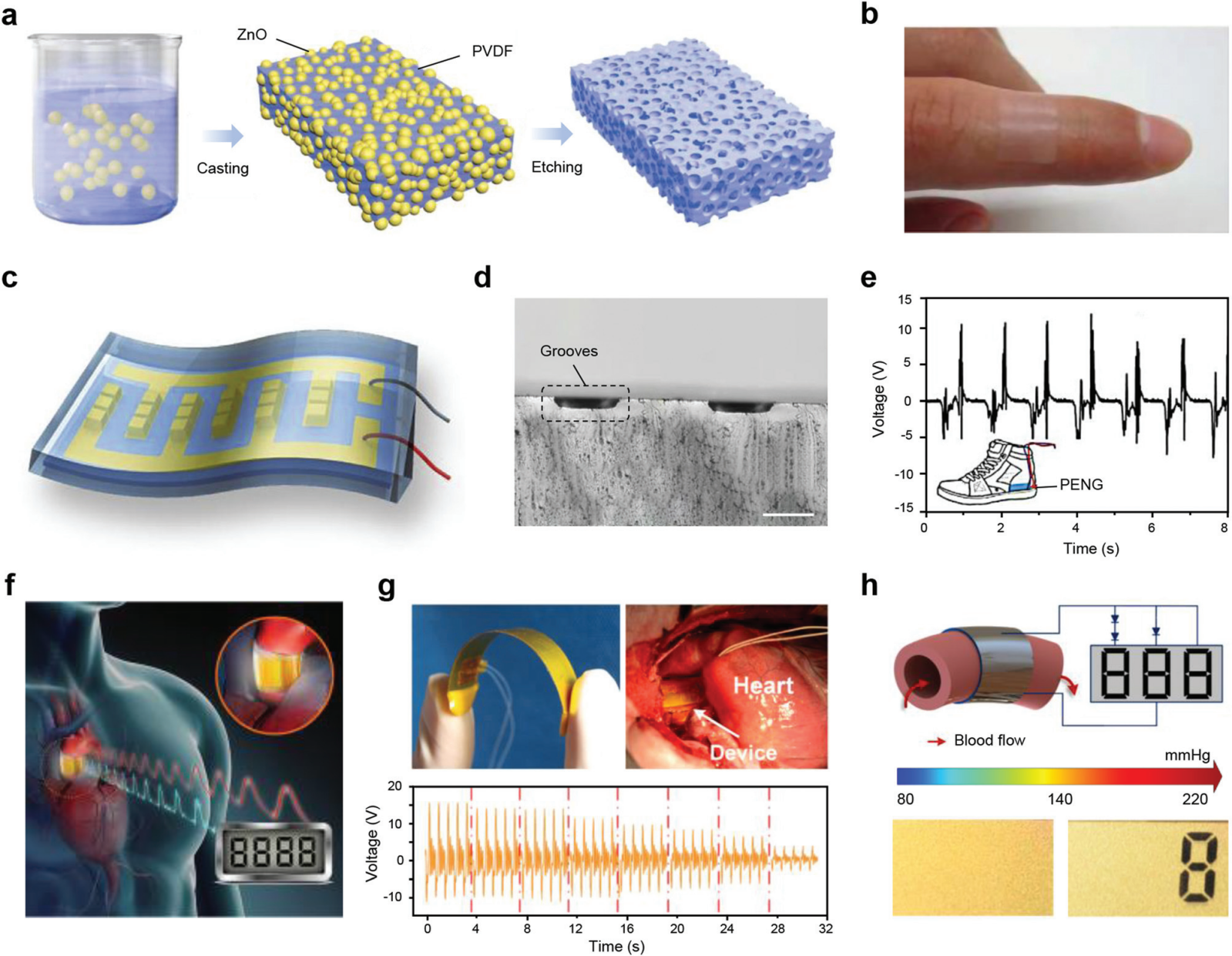 图 5 基于有机压电材料的能量收集。 (a) 制备介孔压电 PVDF 薄膜的示意图。(b) 粘附在手指表面的介孔 PVDF 薄膜的照片。(c) 基于排列的纳米纤维和 3D 叉指电极的 PENG 示意图。(d) PDMS 中凹槽横截面的显微照片。比例尺,500 μm。(e) 缓慢行走的人产生的输出电压。(f) 包裹在主动脉上时在体内使用的 PENG 示意图。(g) 该装置的照片显示其柔韧性并包裹在猪的升主动脉上(上部)。器件的输出电压随不同的压力应用而变化(下半部分)。 (h) 收缩压高于 140 mmHg 时 PENG 点亮 LCD 的系统图和照片。