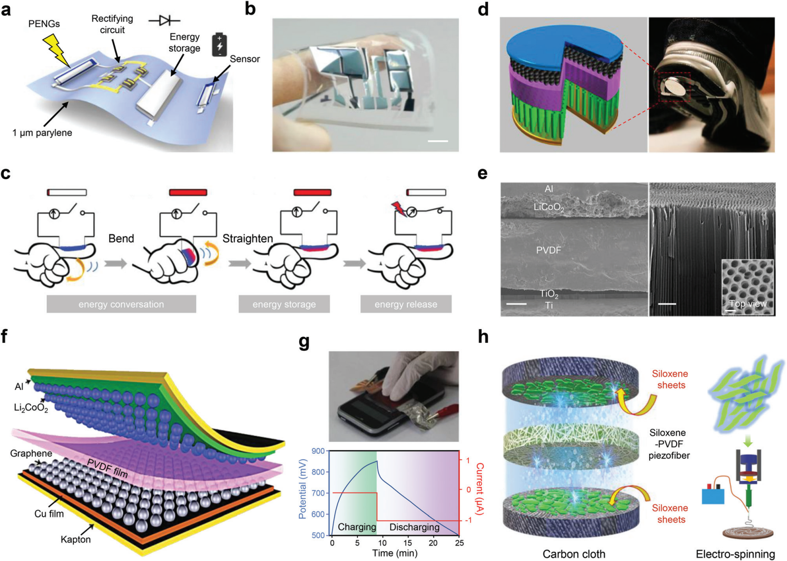 图 8 能量收集和存储的集成。 (a) 集成在 1 μm 薄聚对二甲苯基板上的一系列超柔性器件的方案。(b) 用于收集生物力学能量的超柔性 PENG 的照片。比例尺,1 厘米。(c) 纳米复合膜在生物运动下的能量转换和储存示意图。(d) PENG和锂离子电池混合的自充电电池结构设计。(e) 自充电电池的横截面 SEM 图像(左下角)。比例尺,30 μm。对齐的 TiO2 纳米管的放大图(右下角)。比例尺,1 μm。插图是纳米管的顶视图 SEM 图像。比例尺,200 nm。(f) 显示柔性自充电电池设计的示意图。(g) 通过手指按压充电的柔性自充电电池的照片(上部)。一个典型的自充电和相应的放电过程(下图)。(h) 基于硅氧烷的自充电电池的示意图。