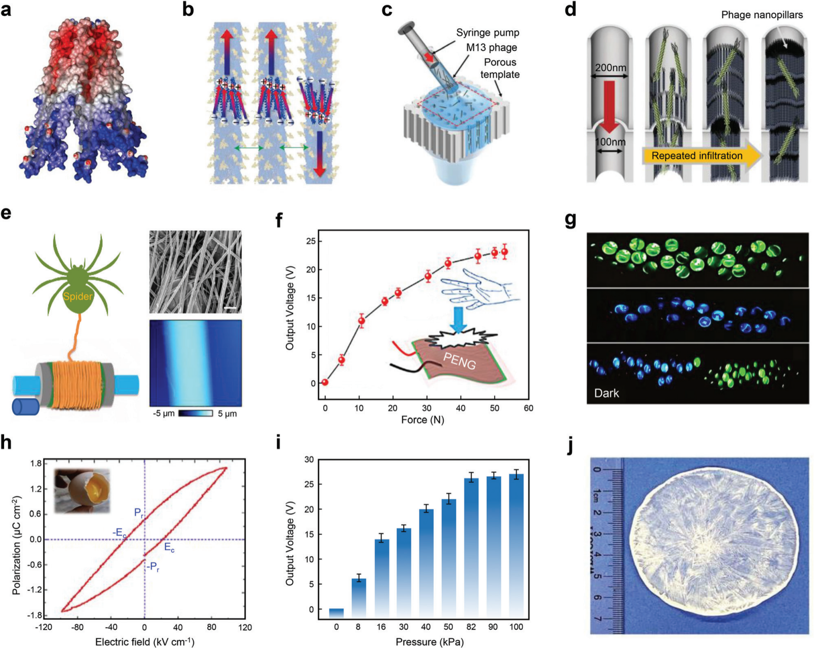图 7 基于自然压电材料的能量收集。 (a) 用四种谷氨酸进行生物工程修饰后的压电 M13 噬菌体结构示意图。( b )通过单层的轴向方向描绘具有随机混合偶极子的噬菌体的压电特性的示意图。(c) 垂直排列的 M13 噬菌体组装的强制渗透示意图。(d) 由多孔模板中的重复渗透控制的噬菌体纳米柱形成的示意图。(e)蜘蛛丝结构示意图(左)。天然蜘蛛丝的 SEM 图像(右上)。比例尺,20 μm。蜘蛛丝的地形图(右下)。(f) PENG 在外力作用下产生的输出电压。(g) 3 个串联单元产生的电力立即点亮绿色和蓝色 LED。(h) 非极化 ESM 的极化和电场曲线。(i) 与压力相关的输出电压。(j) 晶片大小的压电甘氨酸-PVA 薄膜的数码照片。