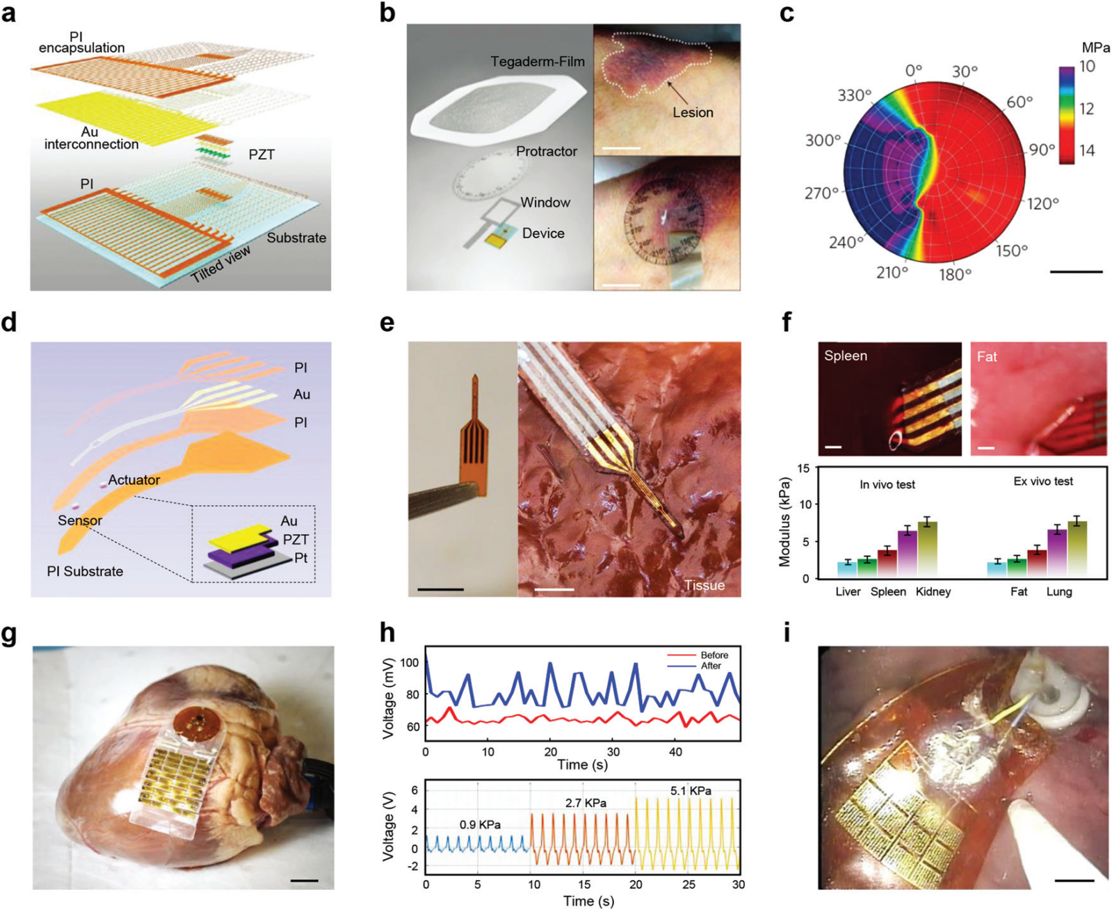 图 13 用于体内生物力学传感的 PENG。 (a) 基于 PZT 纳米带的模量传感器的分解示意图。(b) 系统示意图和前臂照片(不带和带安装设备)。(c) 来自实验的代表性数据。比例尺,2 厘米。(d) 基于超薄 PZT 执行器和传感器的设备示意图。(e) 所述装置(左,比例尺,5 mm)和放置在生物组织上的装置(右,比例尺,2 mm)的光学图像。(f) 活体大鼠体内模量测量的光学图像和结果以及解释后相同器官的离体结果。比例尺,1 毫米。 (g) 可植入传感器在组织(猪心脏)表面的潜在应用。比例尺,1 厘米。(h) 不同压力下猪心脏上传感器的电压输出,以及气动平台上的脉冲和类似心跳的输入(底部)。约克夏猪模型(上)的体内评估中摄入牛奶前后的电压输出图。(i) 基于 PZT 的传感器与胃内经皮内窥镜胃造口管的照片。比例尺,1 厘米。