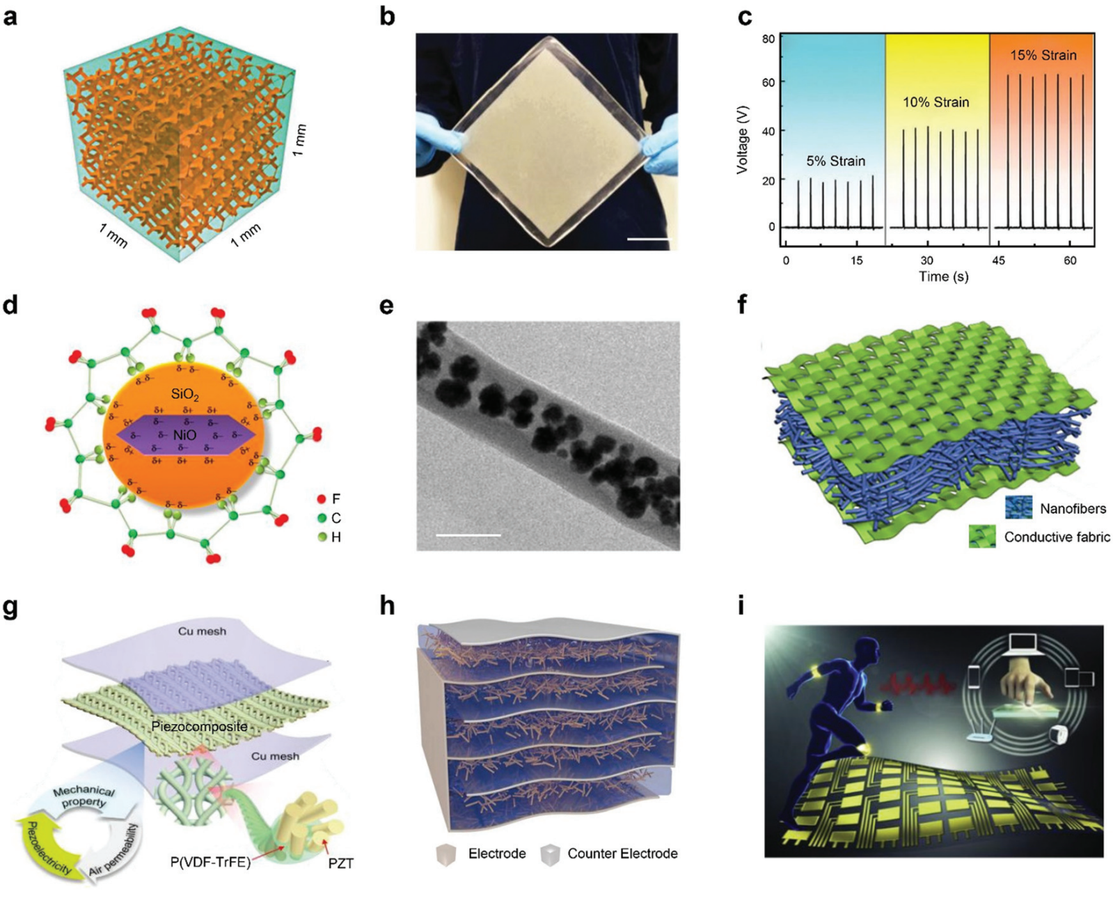 图 6 基于压电复合材料的能量收集。 (a) 3D 互连压电陶瓷泡沫基 PENG 的示意图。(b) 大面积 3D 压电复合材料的照片。比例尺,5 厘米。(c) 3D压电复合材料在不同拉伸应变下的输出电压。(d) 所提出的 β 相形成机制的示意图。(e) 核壳压电纳米纤维的 TEM 图像。比例尺,500 nm。(f) 单个电子皮肤单元的示意图。(g) 基于分层 PZT 陶瓷框架和 P(VDF-TrFE) 涂层膜的 HIPT 复合材料的示意图,以铜网作为电极。(h) 具有 3D 插层电极的基于 Sm-PMN-PT 的 PENG 的示意图。(i) 用于关节运动能量收集的制造电子皮肤的概念验证说明。