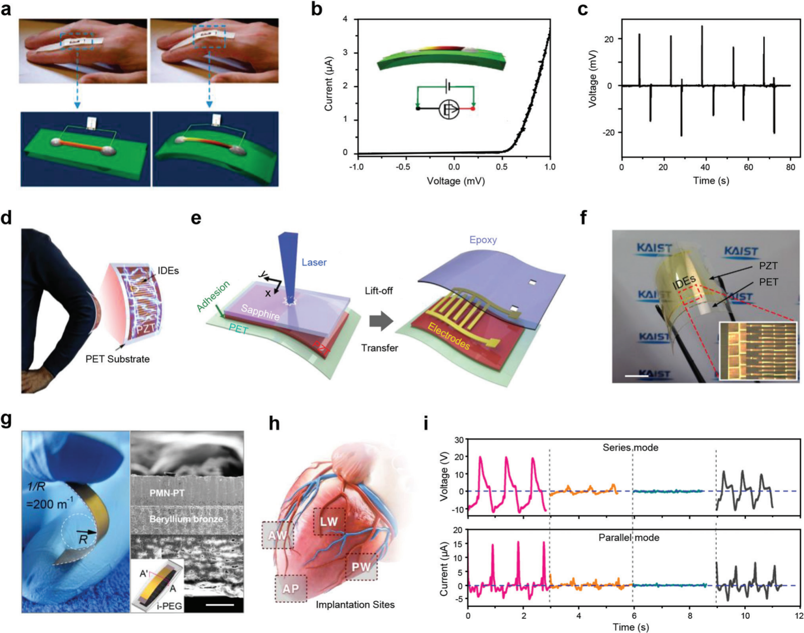 图 4 基于无机压电材料的能量收集。 (a) 基于 ZnO 纳米线的 PENG 连接到人类食指并用手指弯曲的示意图。(b) PENG 的 I-V 特性。插图说明了 PENG 的示意图及其关于测量系统的连接配置。(c) 当手指周期性地来回弯曲时,PENG 产生的开路电压。(d) 使用柔性 PZT 能量收集器的可穿戴应用的示意图。(e) 使用 LLO 方法制备柔性 PZT 薄膜基 PENG 的工艺示意图。(f) 用镊子弯曲的柔性 PZT 能量收集器的照片。比例尺,1 厘米。(g) 用手指弯曲的压电复合材料的照片和弹性骨架上压电复合材料的横截面 SEM 图像。比例尺,50 μm。(h) 不同植入部位的示意图。(i) 来自不同注入位点的串联(上)和并联(下)模式注入的 PENG 的输出性能。