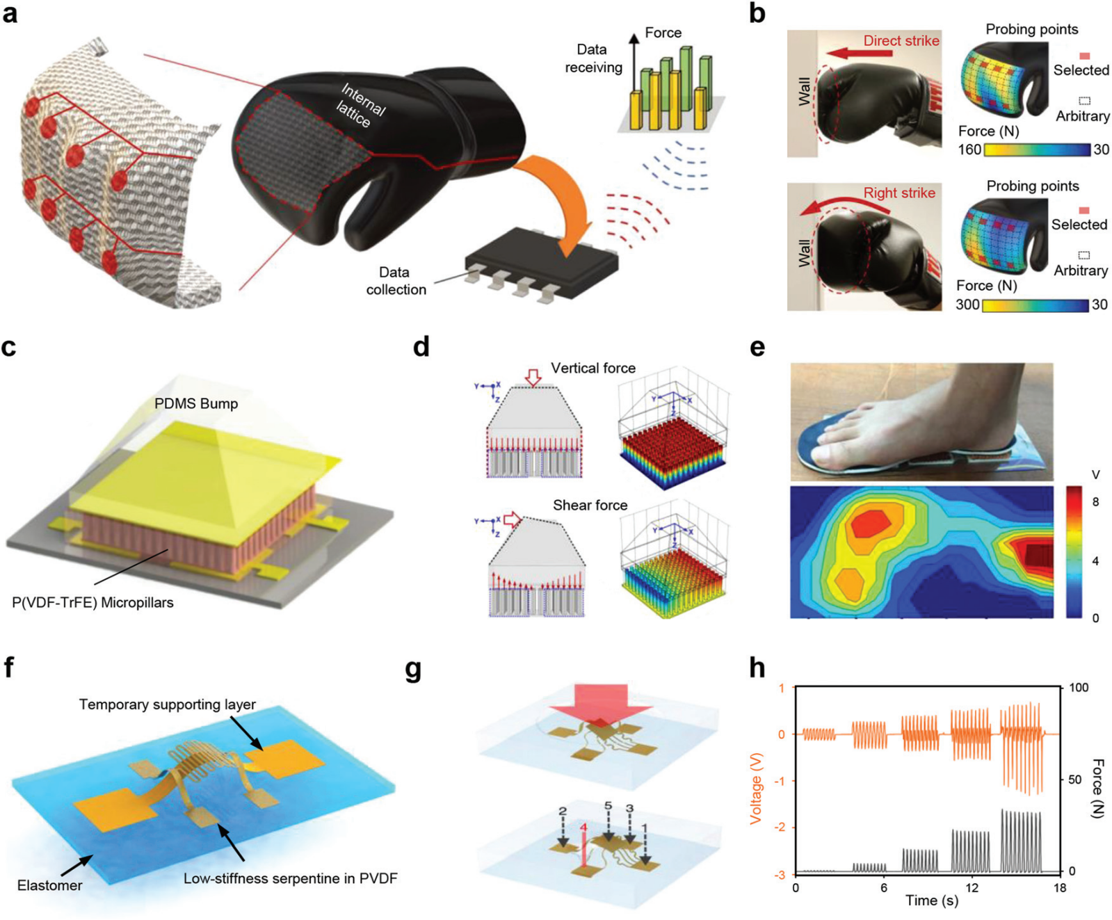 图 12 用于体外生物力学传感的 PENG。(a) 基于具有拉伸主导微架构的 3D 打印柔性压电晶格的无线自感应拳击手套示意图。(b) 手套的光学图像和力量大小的空间分布,当它分别通过直接打击和右勾拳击中墙壁时。(c) 基于压印 P(VDF-TrFE) 微柱阵列的柔性压电三轴触觉传感器示意图。(d) 三轴触觉传感器在法向力和剪切力下的模拟。(e) 集成自供电足部压力传感器阵列的照片和来自物体的压力势的二维等高线图映射。(f) 具有超低刚度的 3D 中尺度压电框架。(g)在大面积(顶部)和小面积(底部)施加压力的装置示意图。(h) 在平方区域上施加不同外力(深灰色曲线)的时域输出电压(橙色曲线)。