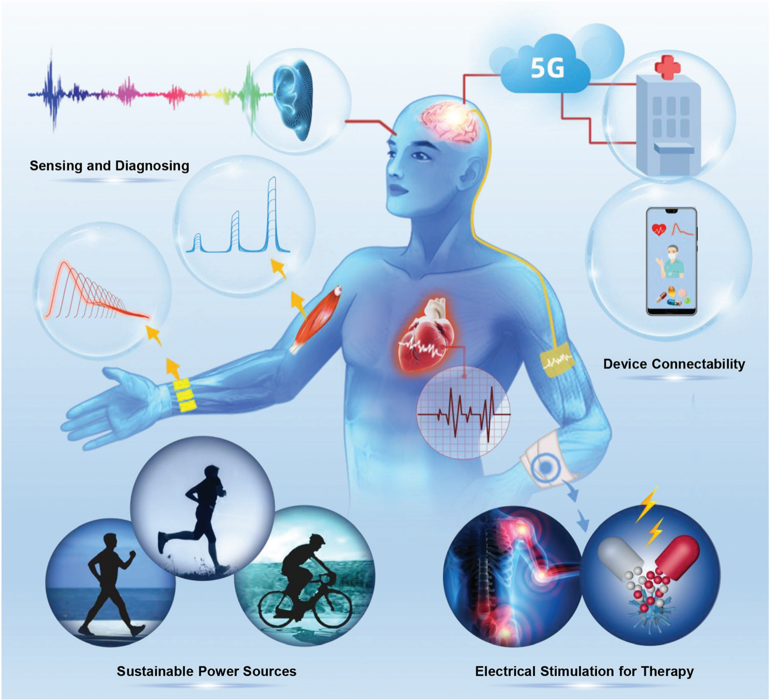 可穿戴生物电子学能够将当前以疾病治疗为中心的医疗保健系统转变为以疾病预防和健康监测为重点的个性化模式。其中,可穿戴传感器可以从人体捕获有价值的信息实现人体健康监测,是成熟的医疗物联网 (IoMT) 系统的核心组件之一。然而,为这些可穿戴设备提供持续稳定的电源仍然是一个重大挑战。传统上,标准供电方式依赖于电池,电子设备配备独立电源以实现独立运行。有效应对此类挑战的一种方法是开发自供电传感器。可以利用生活中的生物力学能量,如:身体活动、心脏/肺运动、血液循环等形式,将这些能量转化为电能,预期将可穿戴设备与传统电池的有限寿命和频繁更换相分离,最终允许用于自供电操作。特别是对于植入式设备,自供电设备可以有效防止需要更换电源的二次手术,提供了巨大的优势和重要的应用前景。