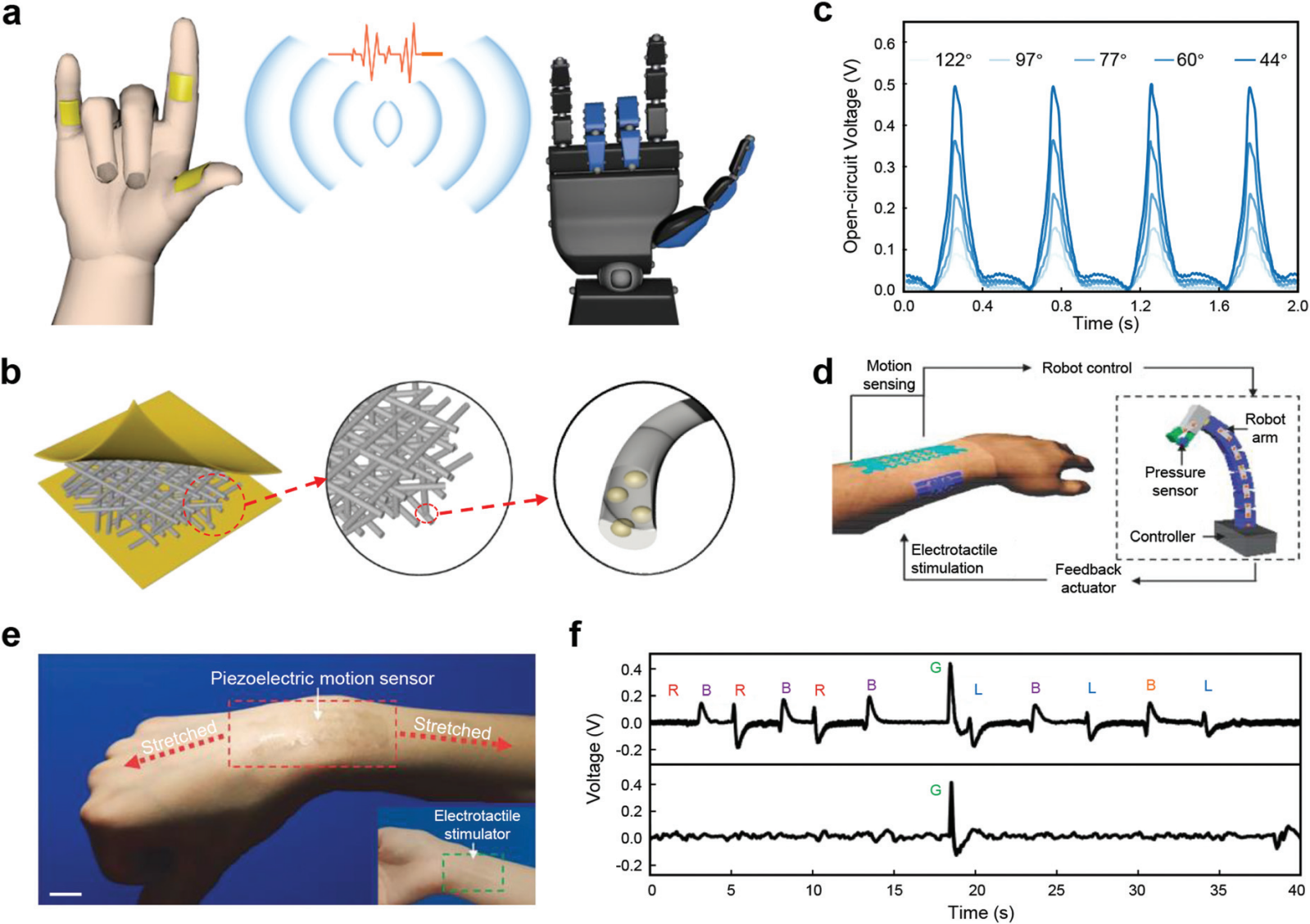 图 10 用于人机交互的 PENG。 (a) 基于豇豆结构的 PVDF/ZnO 纳米纤维的自供电压电传感器示意图,用于远程控制手势。(b) 包含纳米纤维薄膜和单根纳米纤维的设计装置示意图。(c) 以不同角度弯曲产生的开路电压。(d) 交互式人机界面闭环系统示意图。(e) 透明压电运动传感器和电触觉刺激器的图像(插图)。比例尺,20 毫米。(f) 由透明运动传感器(第一行)和夹具上的压力传感器(第二行)获取的检测信号。