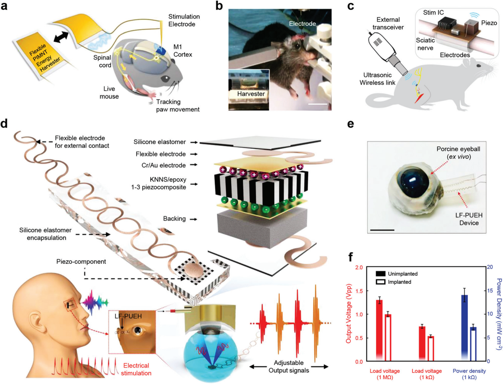 图 19 用于神经刺激的 PENG。 (a) 使用灵活的 PIMNT 收割机对小鼠进行脑刺激的动物实验说明。(b) 连接到双极刺激电极的柔性 PIMNT 刺激器的照片,该电极位于 M1 皮层用于电刺激。比例尺,1 厘米。 (c) 用于刺激大鼠坐骨神经的无电池植入系统示意图。 (d) 用于视网膜电刺激的毫米级柔性超声诱导无线 PENG 的示意图和设计。(e) 植入切除眼球的设备的光学图像,以模拟植入场景。 比例尺,1 厘米。(f) 注入和非注入情况下器件输出电压和功率密度的比较。