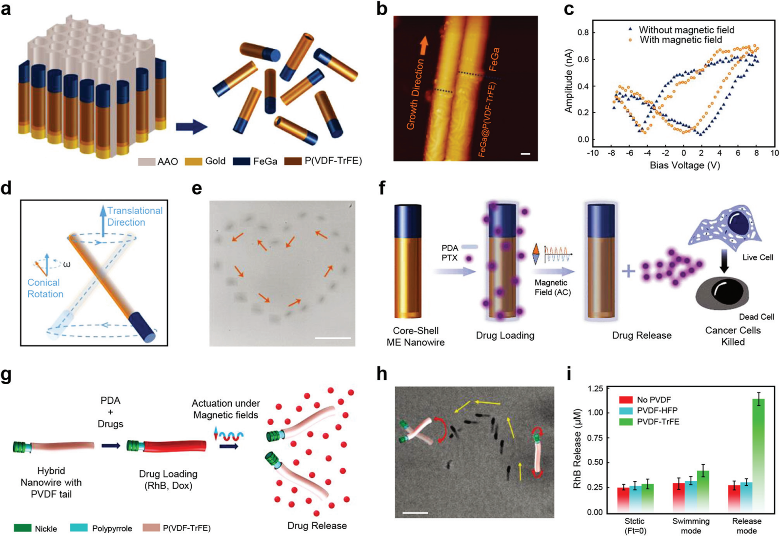 图 17 用于药物输送的 PENG。 (a) FeGa@P(VDF-TrFE)核壳纳米线示意图。(b) 两条纳米线的 AFM 图像,其中 FeGa 由 P(VDF-TrFE) 纳米管生长而成。比例尺,200 nm。(c) 从有和没有磁场暴露的 FeGa@P(VDF-TrFE) 核壳纳米线获得的压电响应幅度环。(d) 核壳纳米线在锥形旋转磁场中的运动示意图。(e) 操纵纳米线以遵循心脏的形状。比例尺,20 μm。(f) 显示按需给药实验的方案。(g) 描述混合纳米线与 PDA 和药物的功能化,然后是磁触发药物释放的方案。(h) 延时图像显示了在改变磁场参数时单个混合纳米细胞从表面行走游泳模式转变为摆动运动。比例尺,15 μm。(i) 显示在不同磁驱动下,无 PVDF、有 P(VDF-HFP) 和有 P(VDF-TrFE) 的 NW 释放 RhB 的图。