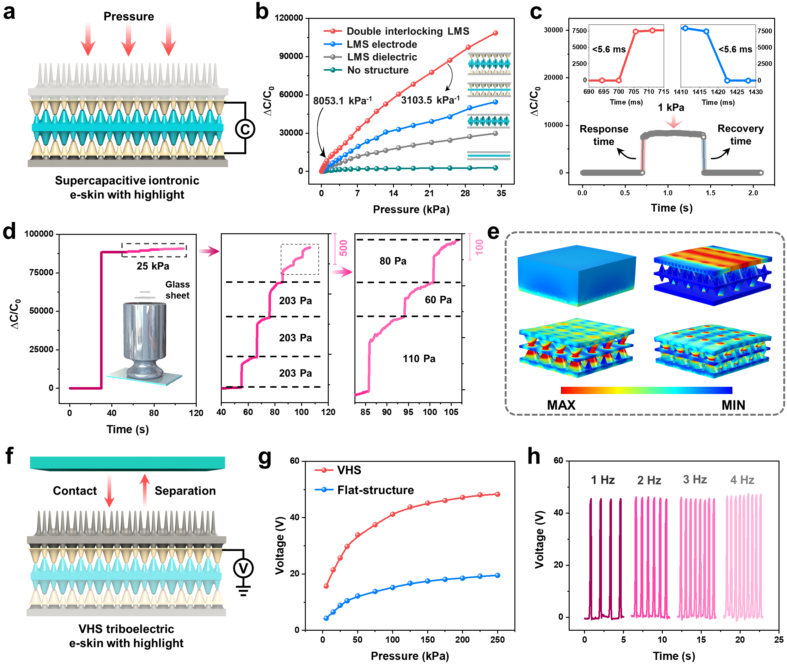 图2 超级电容离子式e-skin部分和摩擦电式e-skin部分的性能表征
