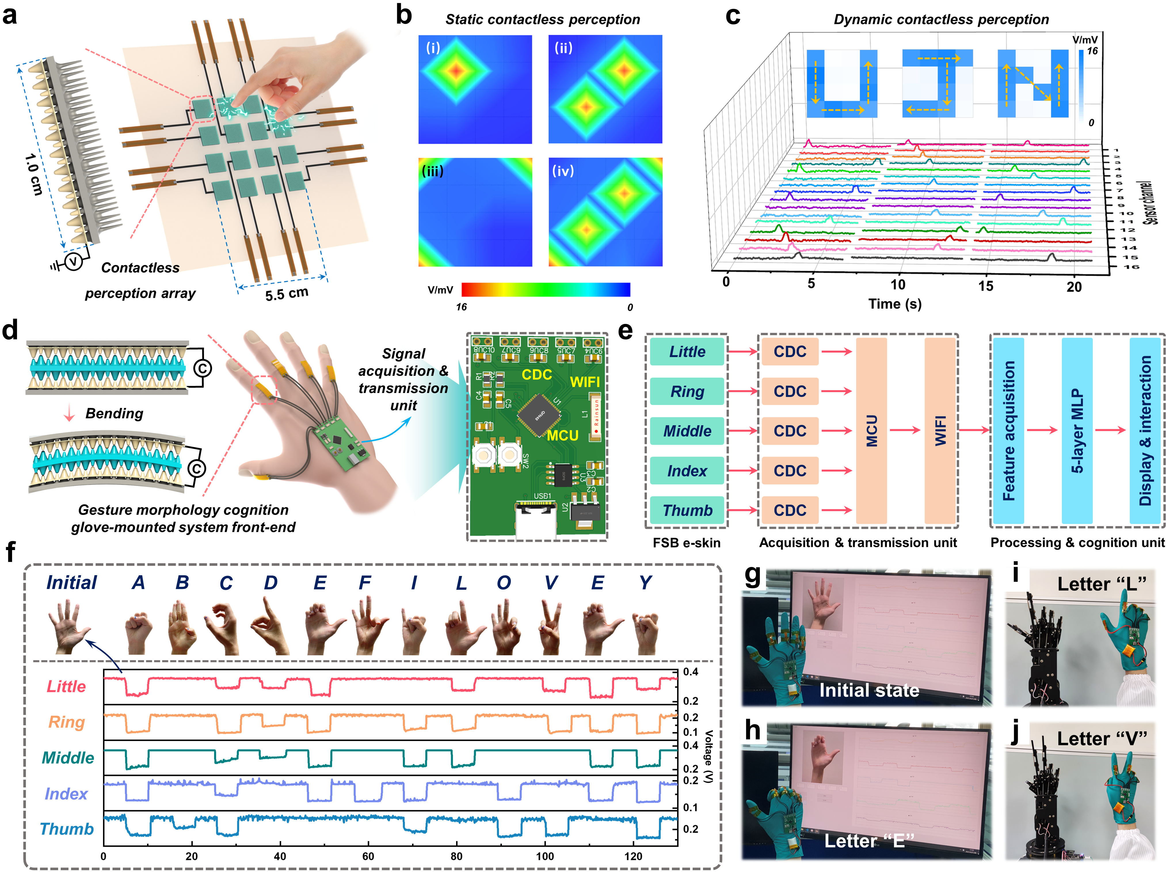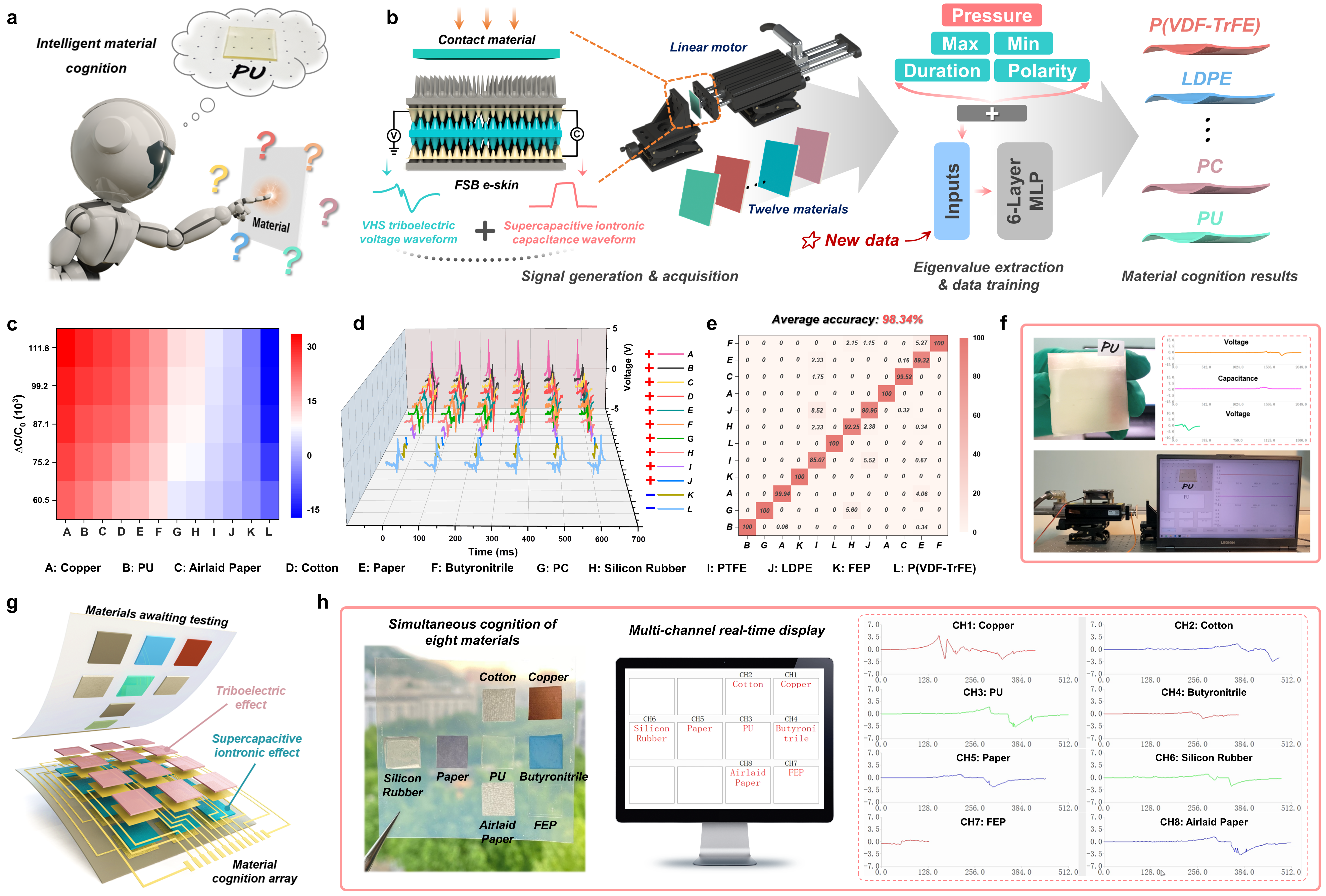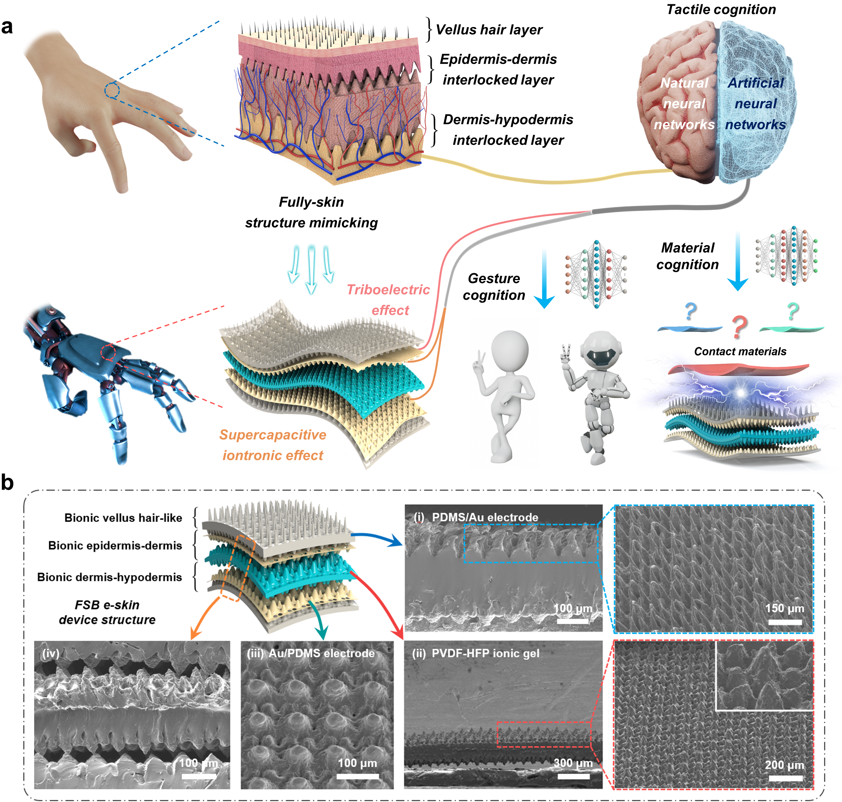 近期,济南大学李阳教授团队和北理工沈国震教授团队通过将摩擦电效应与超电容离子效应相结合,提出了一种基于仿生汗毛和表皮-真皮-皮下组织双互锁微锥结构的高性能全皮肤仿生(FSB)电子皮肤(e-skin),并展示了其从触觉感知到先进智能触觉认知的应用前景。FSB e-skin拥有一系列优异的性能,包括8053.1 kPa-1(<1 kpa)的超高灵敏度,3103.5 kpa-1 (1-34 kpa)的线性灵敏度,快速响应/恢复时间(<5.6 ms)和低检测极限(0.05 pa),这些都是满足智能化需求的关键。为了证明fsb e-skin具有从触觉感知到先进智能触觉认知的能力,探索了三种具体应用:(1) 基于fsb e-skin的摩擦电效应,开发了汗毛状结构的柔性触觉感知阵列来模拟汗毛的静态/动态非接触式触觉感知。(2) 在fsb e-skin的超级电容离子效应的支持下,开发了一种基于多层感知机(mlp)神经网络的手势形态认知手套佩戴系统,以促进一般智能触觉认知,包括手语者和非手语者之间的正常交流和无线机器手交互。(3) 作为本工作的核心,借助摩擦电效应和超级电容离子效应的协同作用,并将fsb e-skin与6层mlp神经网络和信号采集、传输、处理、显示等功能模块相结合,构建了先进智能材料认知系统。该系统能够通过一次接触实现对12种形态模糊、表面光滑材料的实时识别,平均准确率达到98.34%。在此基础上,还构建了一种柔性材料认知阵列,以说明其在同时感知多个物体的材料特性和位置方面的应用潜力。