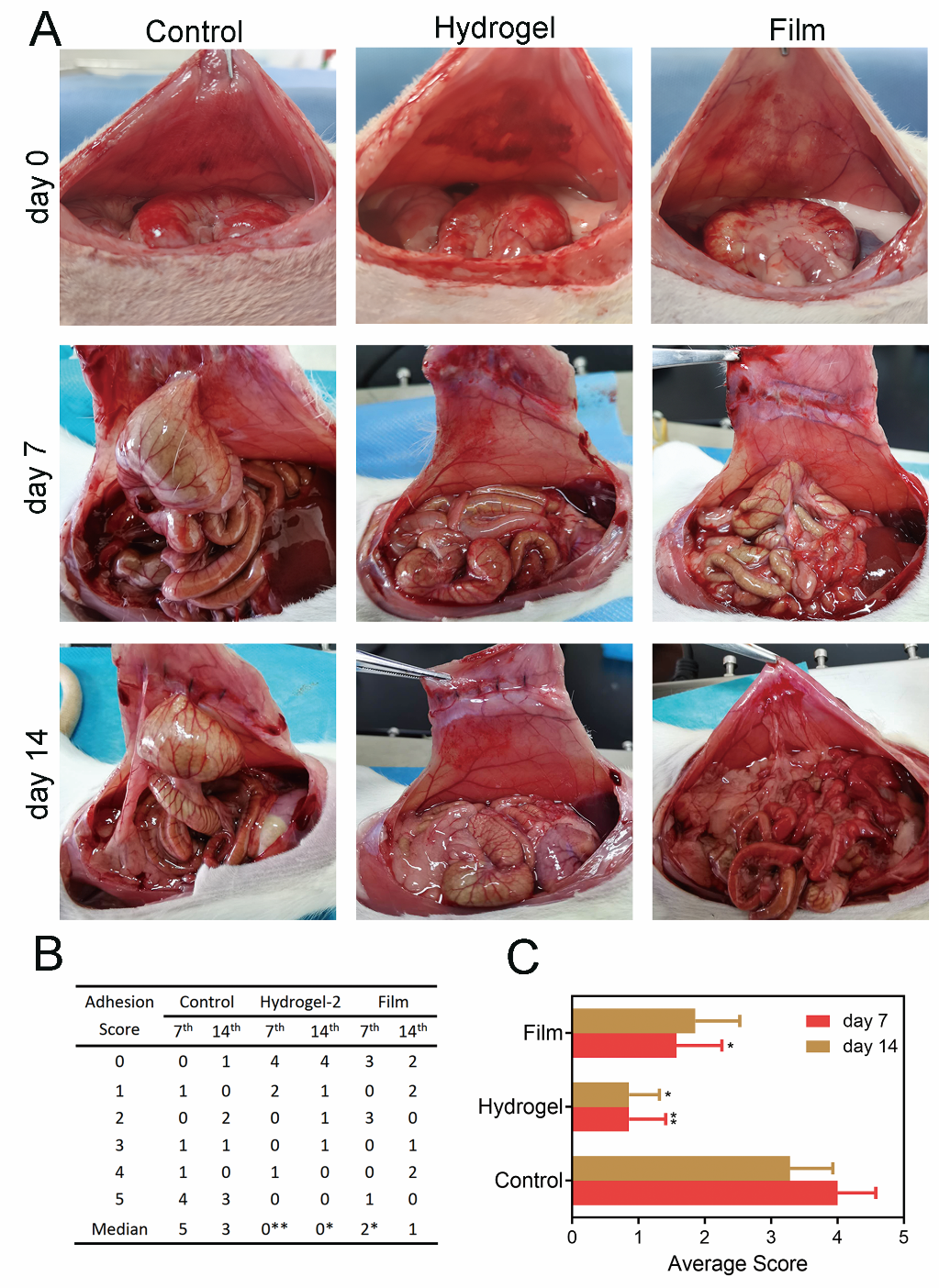 图5. J-1-ADP水凝胶在大鼠腹壁缺损?盲肠磨损模型中抗粘连作用。A为术后7天,14天腹壁粘连的代表图片;B,C为不同组的术后粘连评分。