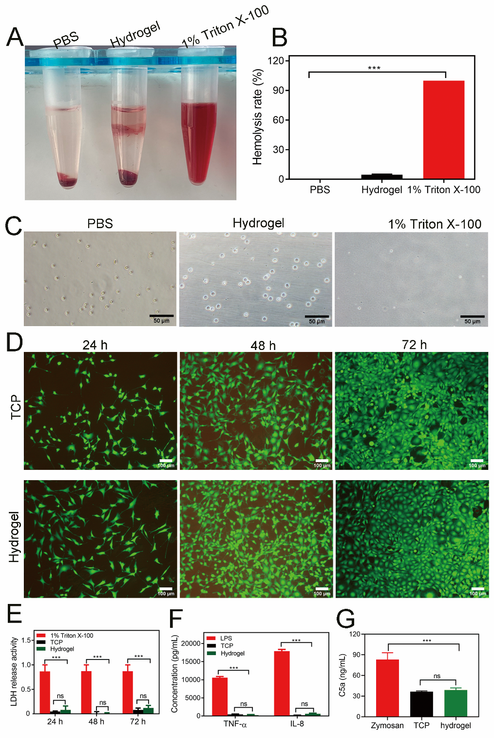 图6. J-1-ADP水凝胶的生物相容性实验。A,B,C为其血液相容性研究;D,E为其与哺乳动物细胞相容性研究;F和G为其免疫相容性研究。