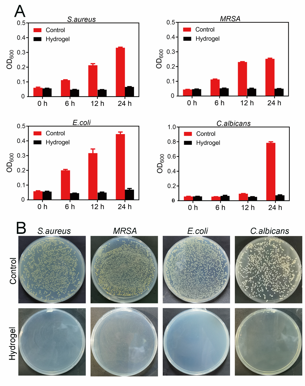 图3. J-1-ADP水凝胶对金黄色葡萄球菌、MRSA、大肠杆菌和白色念珠菌的增殖及菌落形成的影响。