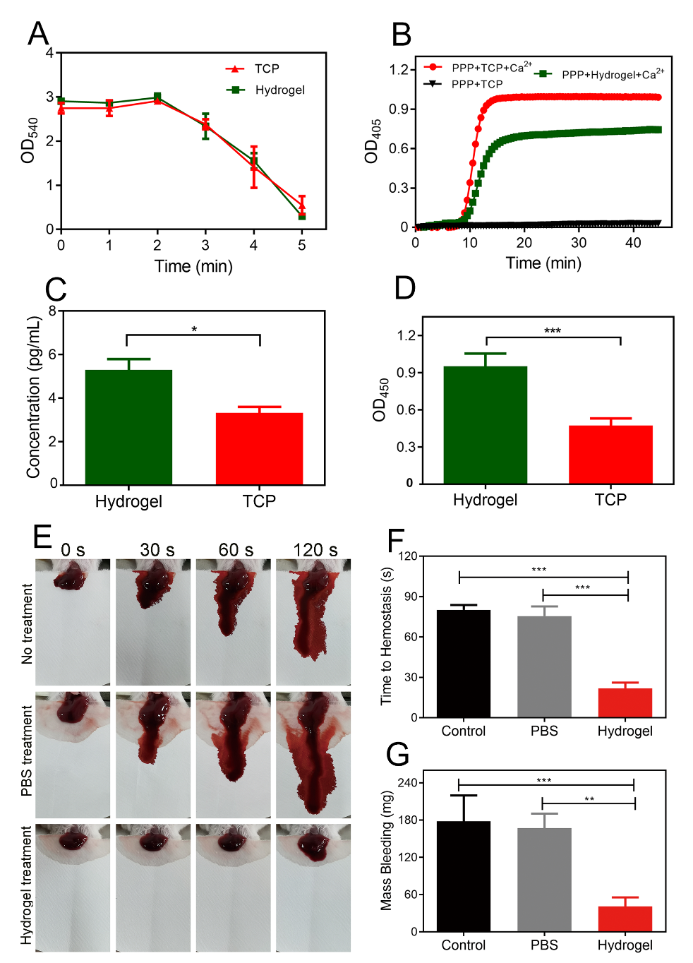 图4. J-1-ADP水凝胶的体外、体内凝血实验。A,B,C,D分别为水凝胶的全血凝血,血浆凝血,血小板激活及血小板粘附实验;E为小鼠肝脏出血模型凝血实验,F为凝血时间,G为出血质量。