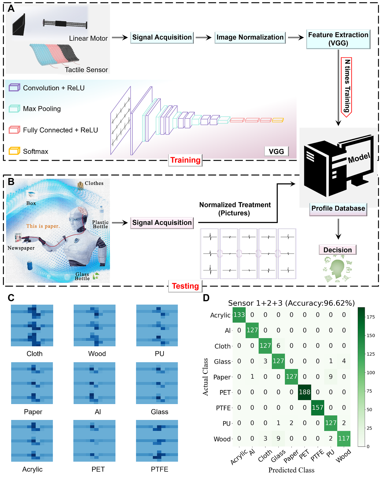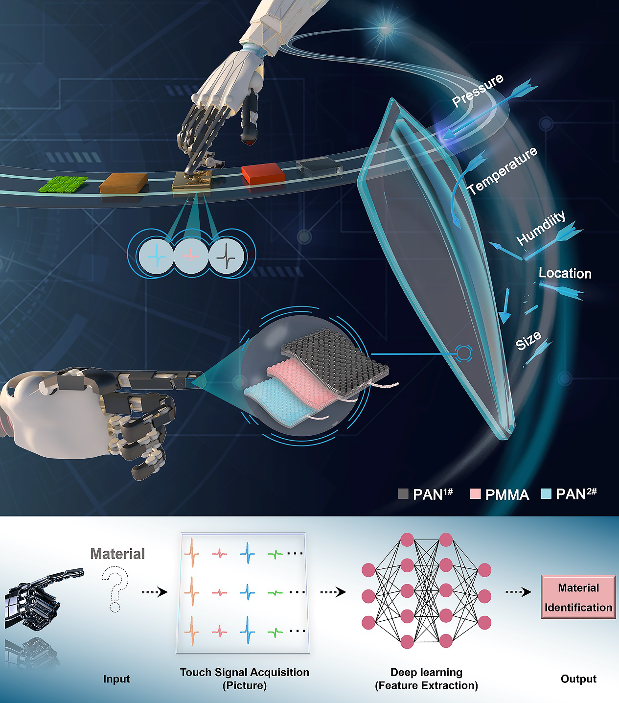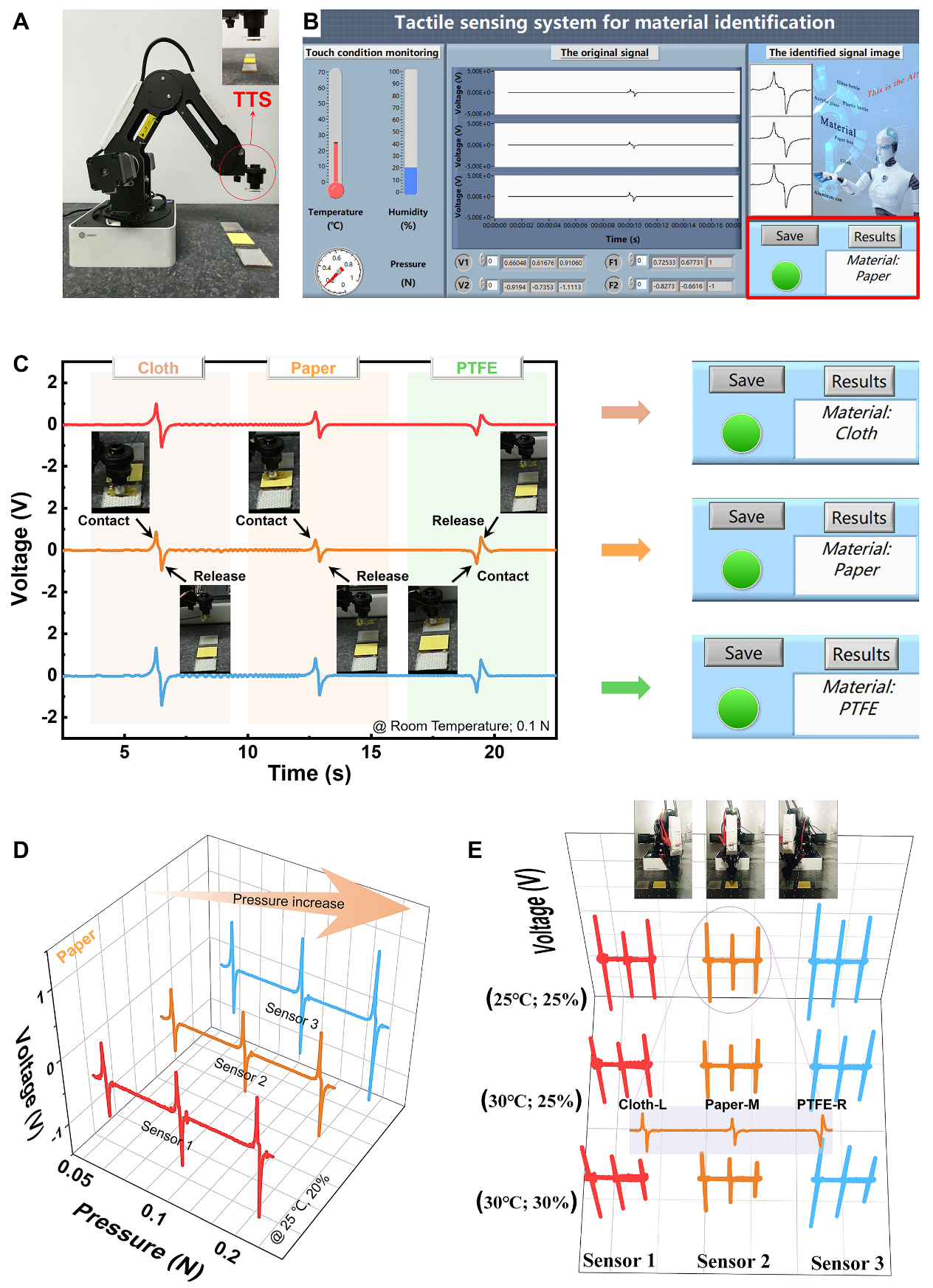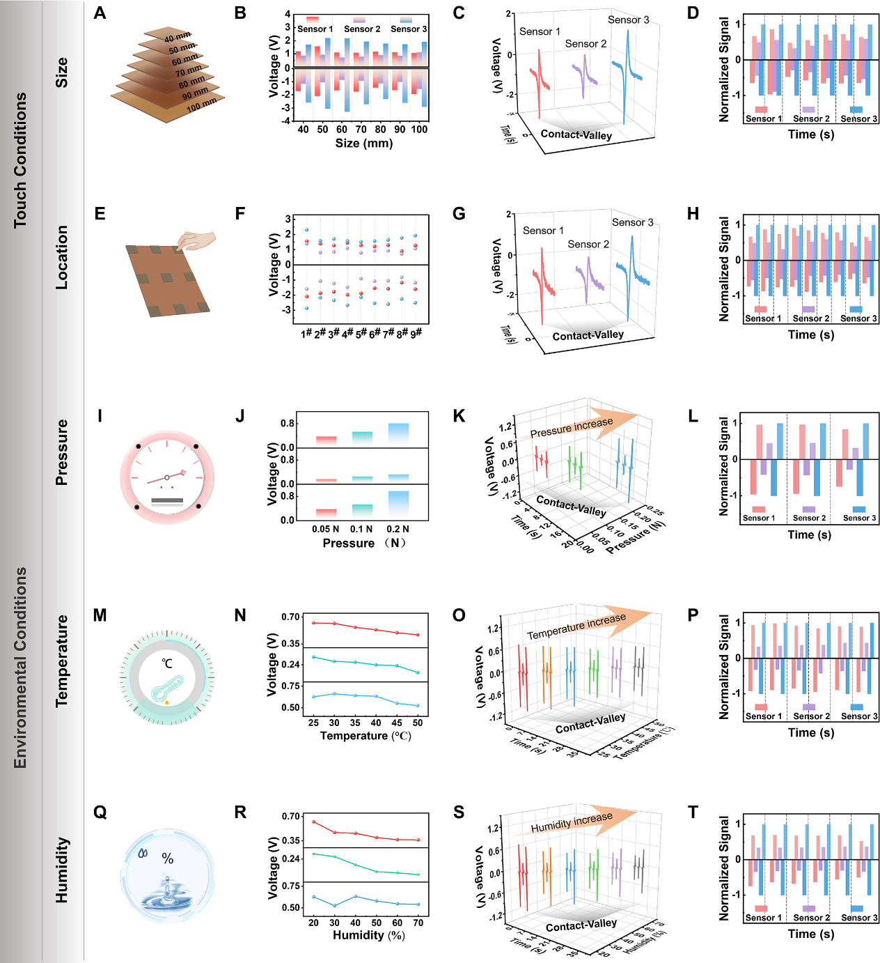 图1 基于摩擦电信号和深度学习的智能触觉传感系统,可实现不同接触条件和环境条件下的准确辨识