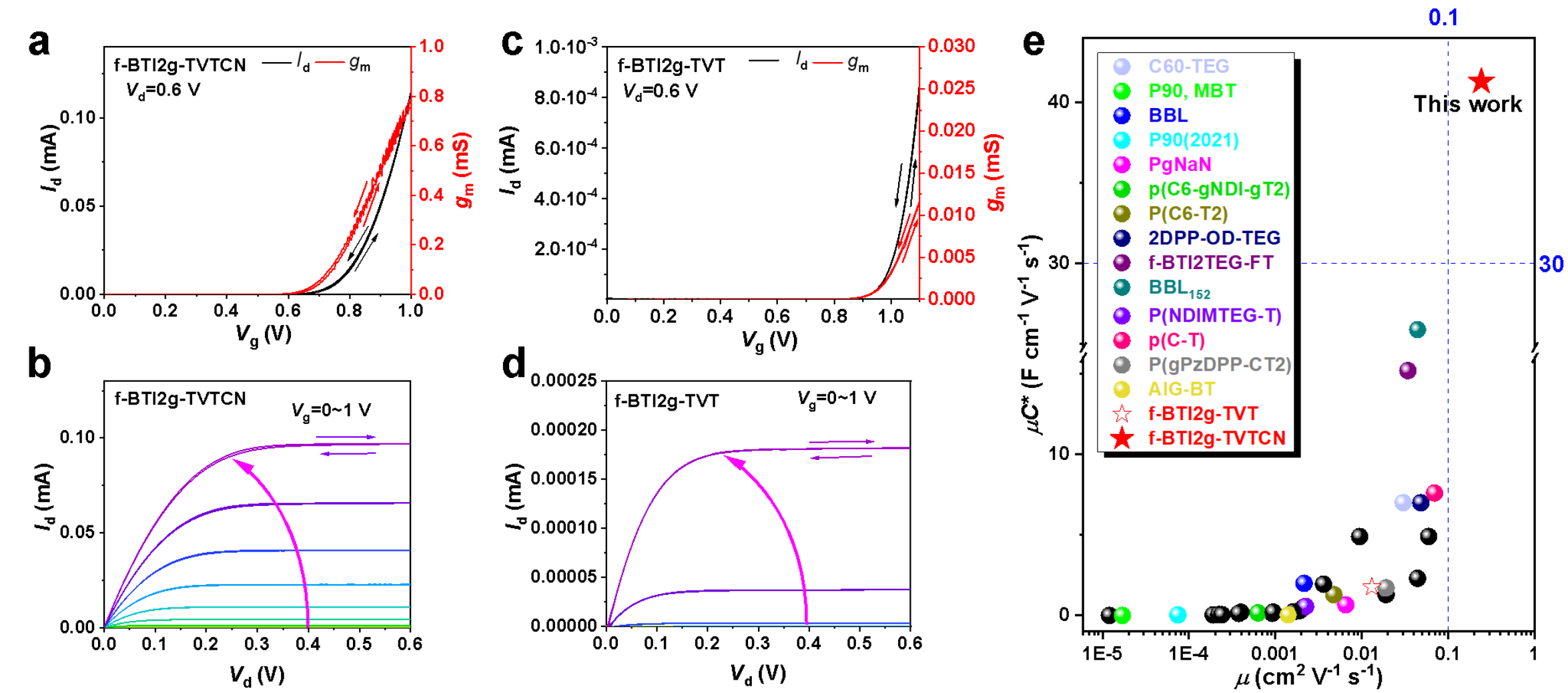 图2. (a)f-BTI2g-TVTCN器件的转移曲线图。(b)f-BTI2g-TVTCN器件的输出曲线图。(c)f-BTI2g-TVT器件的转移曲线图。(d)f-BTI2g-TVT器件的输出曲线图。(e)文献报道和本论文中的n-型沟道材料μC*值对μ值作图。
