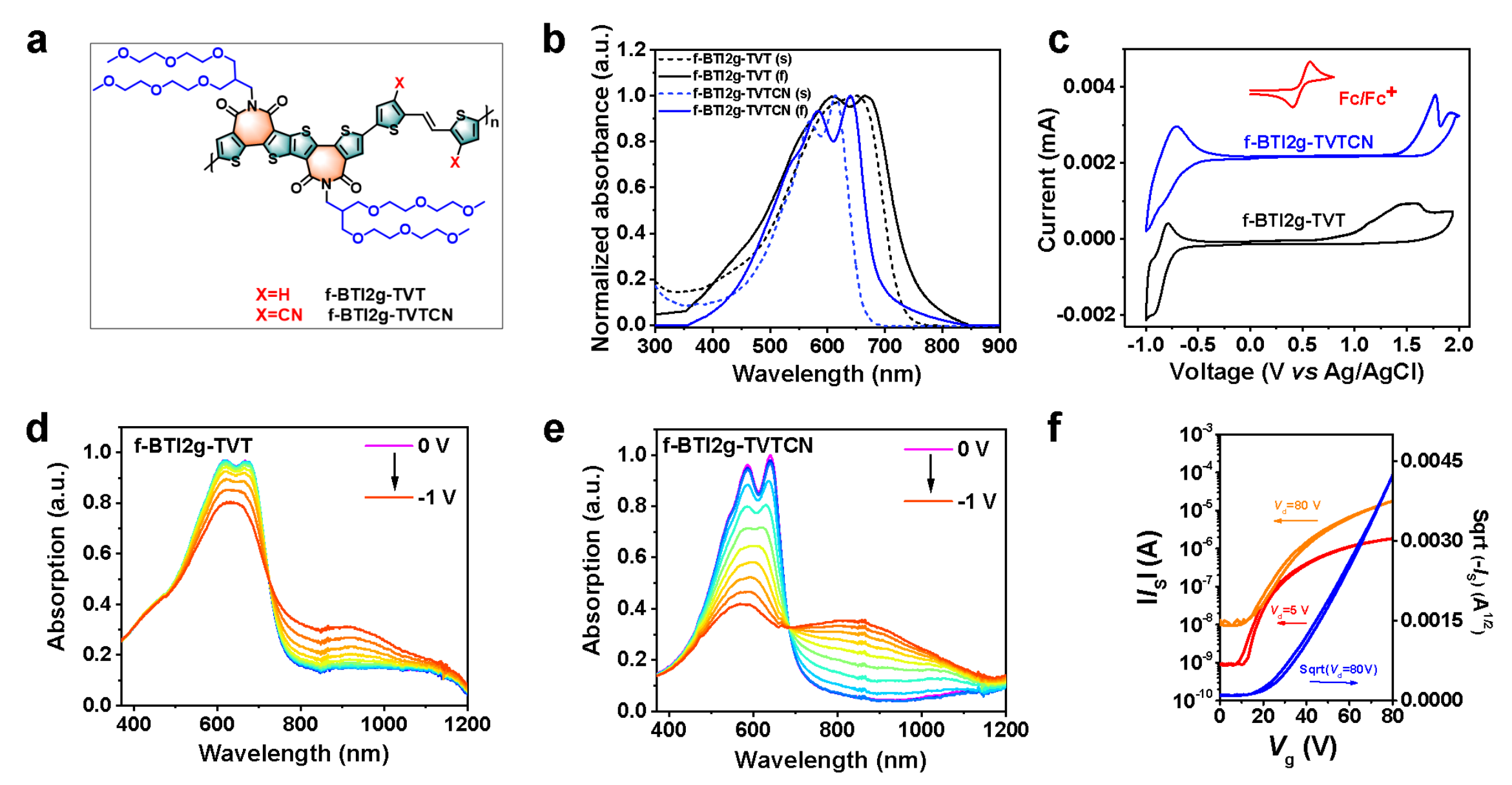 图1. (a)高分子f-BTI2g-TVT和氰基化高分子f-BTI2g-TVTCN结构示意图。(b)高分子的吸收光谱。(c)高分子的循环伏安曲线。在持续施加偏压下,(d)f-BTI2g-TVT和(e)f-BTI2g-TVTCN的吸收光谱变化示意图。(f)f-BTI2g-TVTCN的有机薄膜晶体管转移曲线。