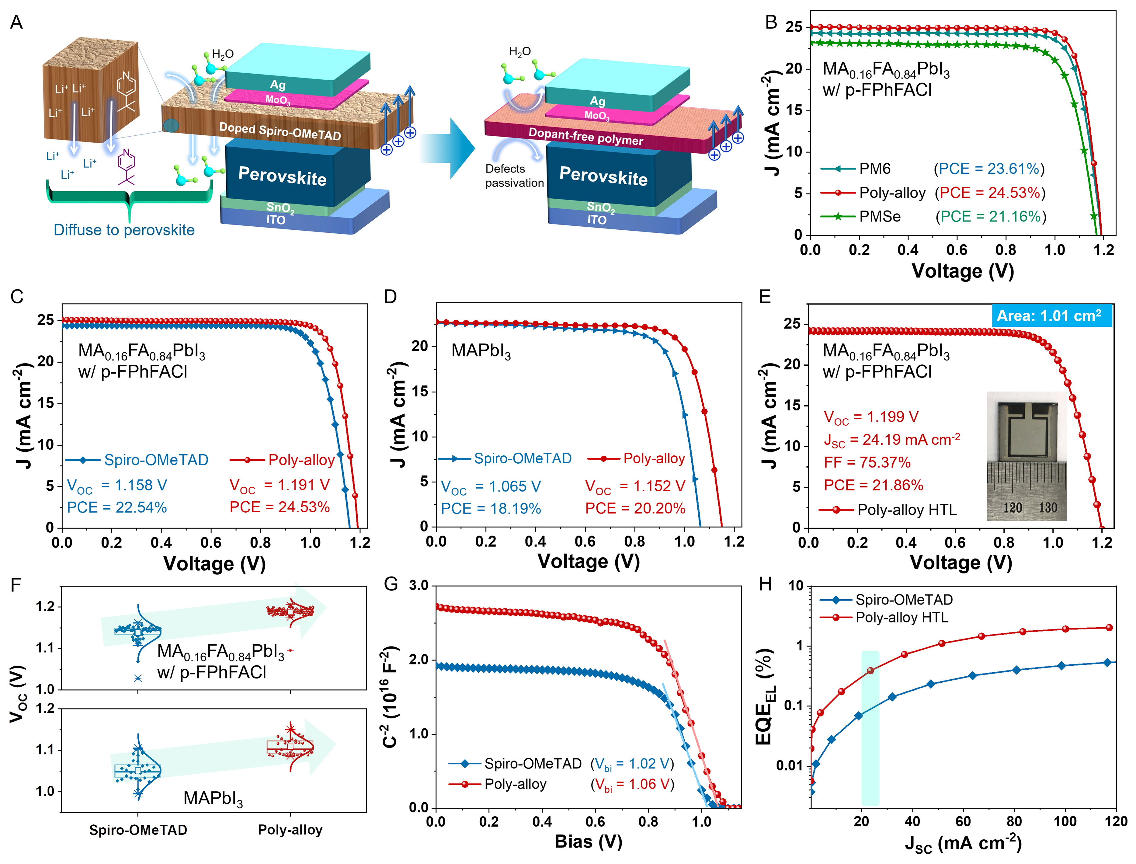 图4.(A)钙钛矿太阳能电池的器件结构,说明了基于离子型掺杂的Spiro-OMeTAD的器件的缺点和基于非掺杂聚合物HTL的器件的优点。(B)基于不同聚合物HTM的器件的J-V曲线。(C,D)基于不同钙钛矿组分的非掺杂Poly-alloyHTL和掺杂的Spiro-OMeTAD的器件的J-V曲线(E)基于非掺杂Poly-alloyHTL的大面积PSC(面积:1.01 cm2)的J-V曲线。(F)相应器件的统计VOC数据。(G)相应器件的Mott-Schottky图。(H)当器件作为发光二极管(LED)运行时,EQEEL与注入电流密度的关系。