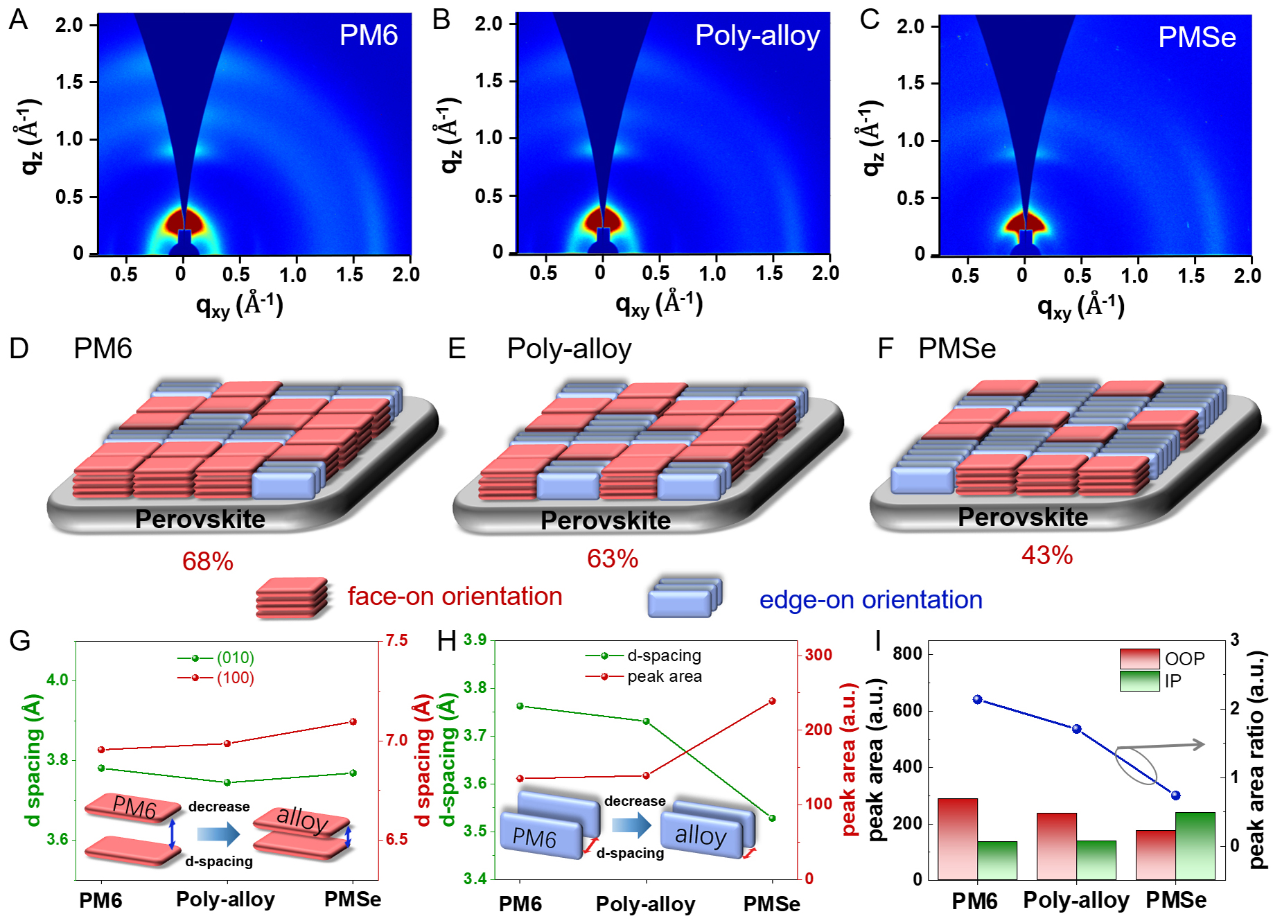 图2.(A,B,C)PM6,Poly-alloy和PMSe薄膜的GIWAXS散射图。(D,E,F)PM6、Poly-alloy和PMSe薄膜的堆积取向分布示意图。(G)面外(OOP)的π-π堆积衍射的d间距。(H)PM6、Poly-alloy和PMSe在面内方向的π-π堆积衍射的d间距。(I)PM6、Poly-alloy和PMSe在面外和面内方向的π-π堆积衍射的峰面积和峰面积比。