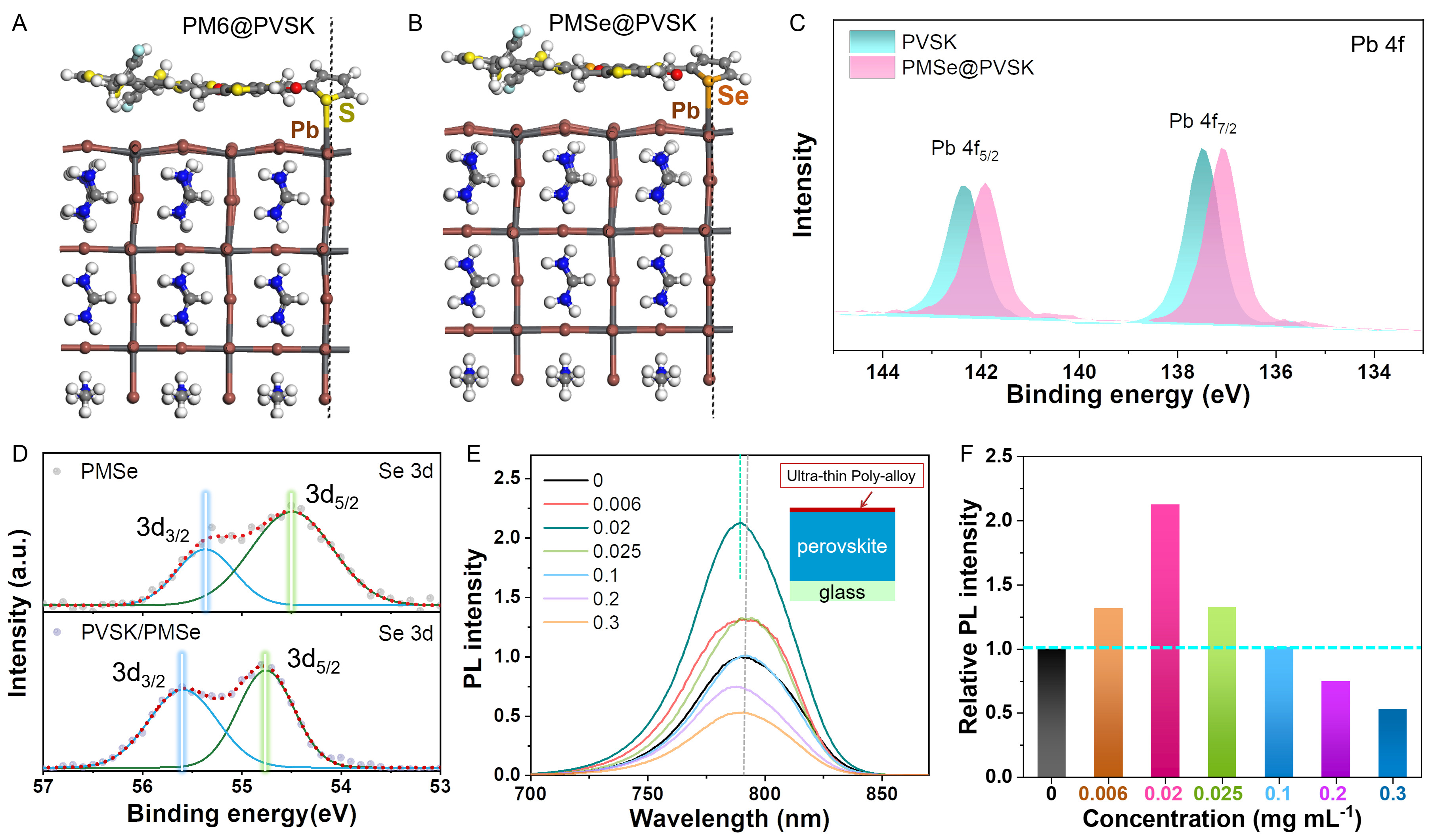 图3.(A,B)DFT计算的PM6(A)和PMSe(B)在钙钛矿(PVSK)表面的堆积。(C)原始钙钛矿薄膜和涂有PMSe薄层的钙钛矿薄膜的XPS的Pb4f峰。(D)原始钙钛矿薄膜和涂有PMSe薄层的钙钛矿薄膜的XPS的Se 3d峰。(E)涂有不同厚度的超薄Poly-alloy HTL层的钙钛矿薄膜的稳态荧光(PL)光谱。(F)从图3E中相应的PL曲线中提取的涂有Poly-alloy的钙钛矿薄膜的相对PL峰值强度与Poly-alloy厚度的关系图。