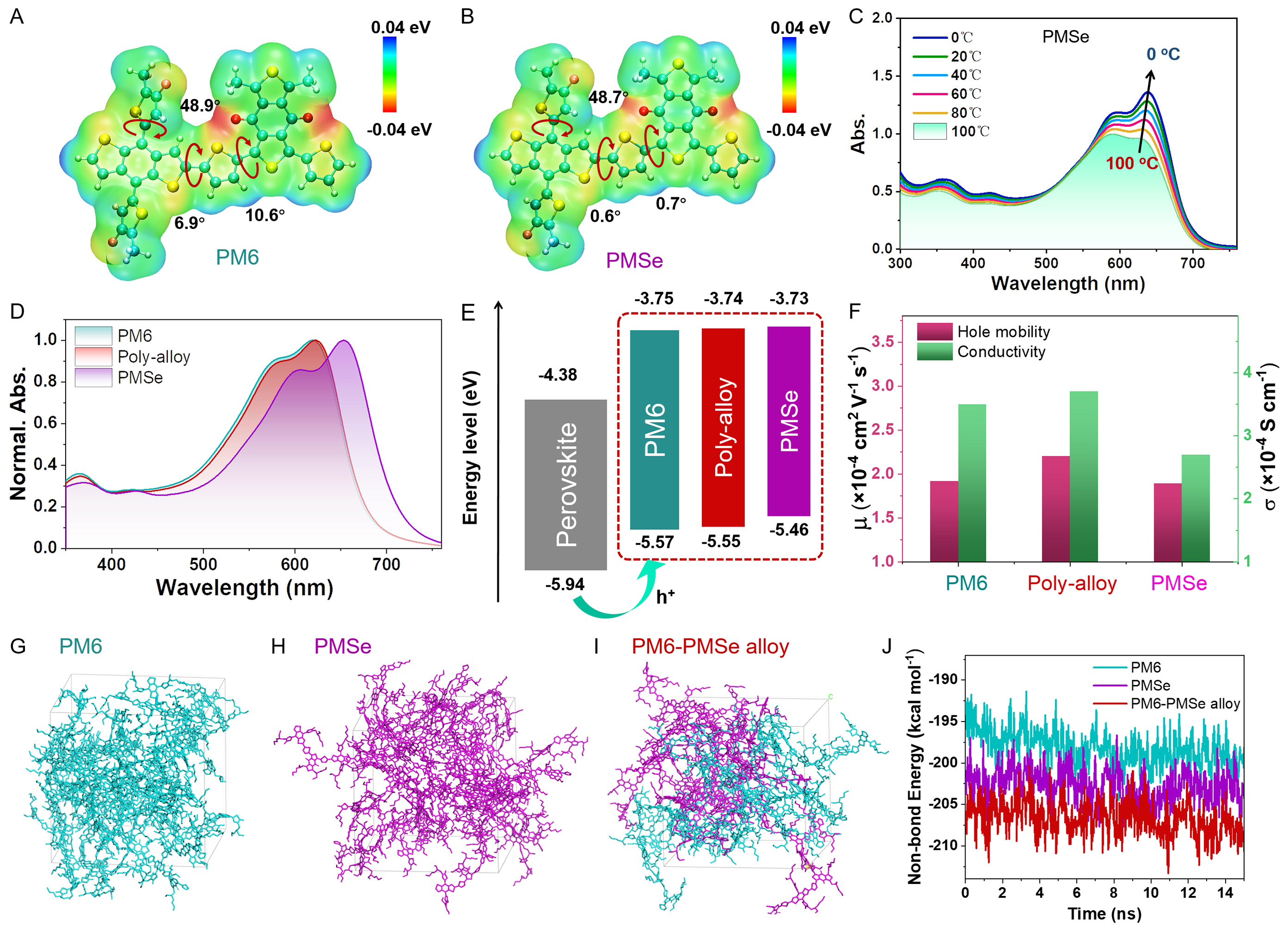 图1.(A)PM6和(B)PMSe的分子模型和表面静电势分布(ESP)。(C)PMSe溶液在不同温度下的紫外-可见吸收光谱。(D)PM6、Poly-alloy和PMSe的薄膜紫外-可见吸收光谱。(E)能级排列的示意图。(F)PM6、Poly-alloy和PMSe薄膜的平均空穴迁移率和导电率。(G,H,I)DFT计算的的三种聚合物体系的模型:(G)PM6,(H)PMSe,和(I)Poly-alloy。(J)聚合物体系内部分子间的非键合能。