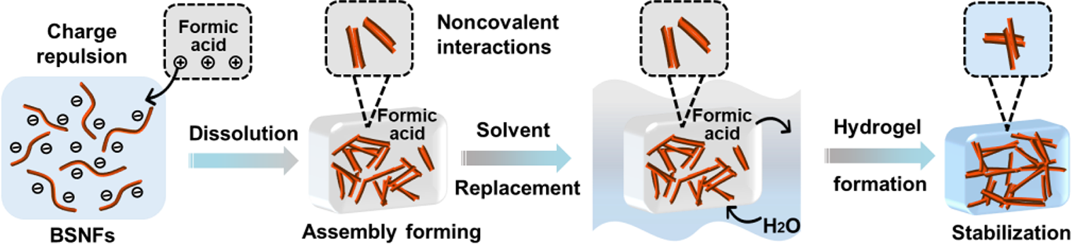 图1 通过溶剂置换法将甲酸替换成水形成高强度丝蛋白水凝胶的过程