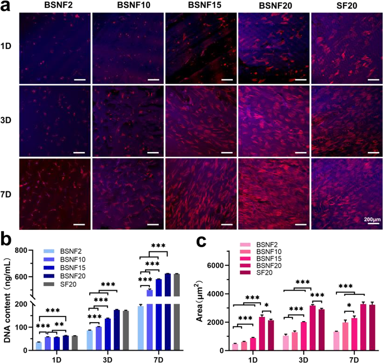 近期,苏州大学吕强教授团队在深化丝蛋白纳米纤维理解的基础上,对现有制备方法体系进行重构,通过调整溶剂体系,利用甲酸优化纳米纤维之间的相互作用,然后将甲酸和水相互置换,在水相体系保留并固定丝蛋白纳米纤维的相互作用,制备高强度丝蛋白纳米纤维水凝胶(图1)。水凝胶高强高韧,能够承受各种形式的变形(图2),其力学强度、模量和韧性分别达到 1.55±0.06 MPa、5.88±0.82 MPa和0.85±0.03 MJ m-3(图3),相比于文献中其他方法制备的丝蛋白水凝胶力学性能显著提升。纳米纤维水凝胶在保持良好生物相容性的基础上,可通过改变水凝胶的模量主动调控干细胞的粘附和增殖行为(图4),优化其诱导干细胞成骨分化的能力(图5),在生物工程方面显示出广阔的应用前景。