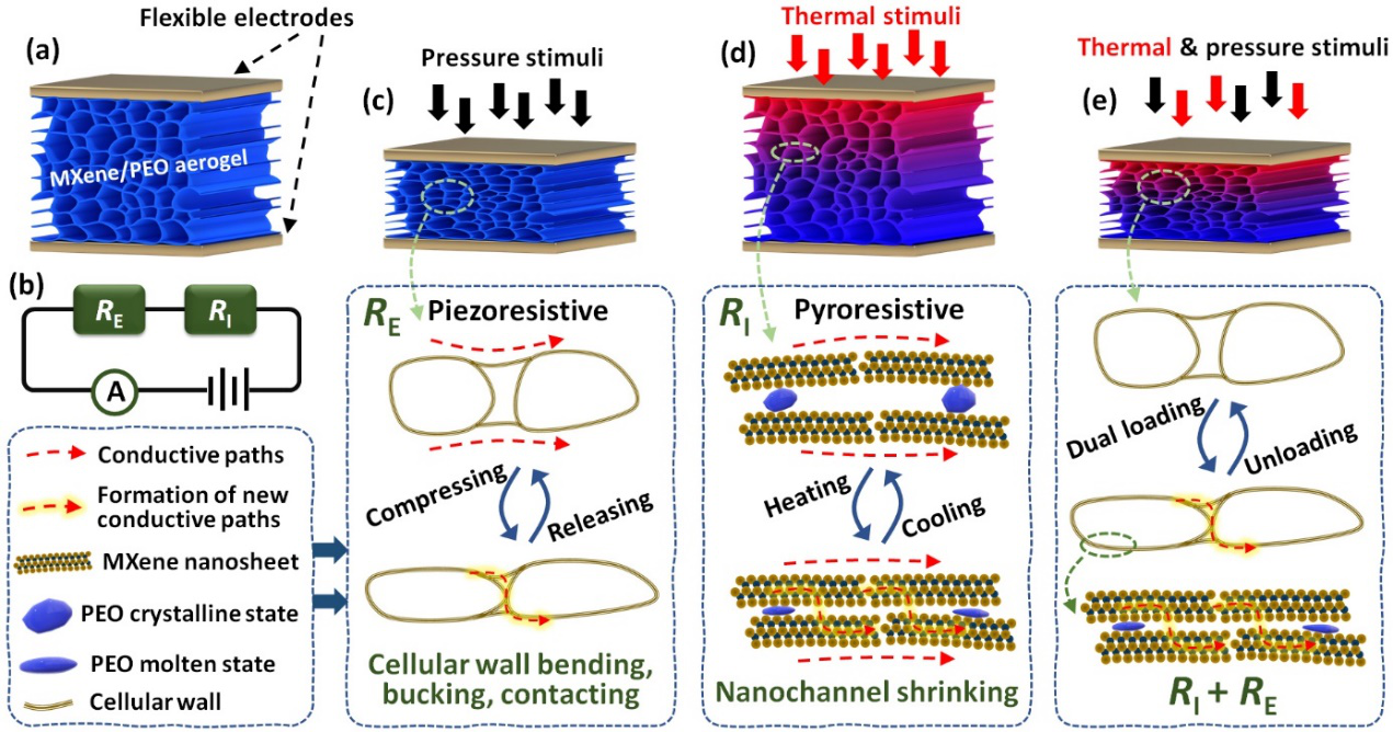 图1. MXene/PEO气凝胶的结构和双重传感机理图