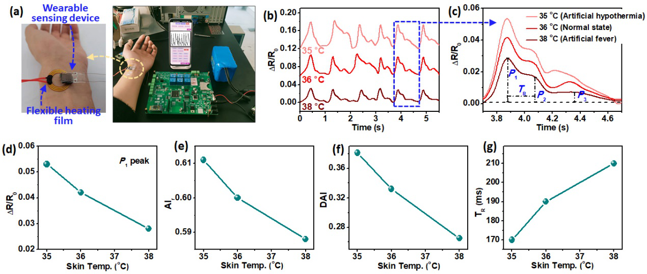 在现代医学中,对动脉脉搏波形的实时、无创监测,可诊断与动脉硬化,高血压,糖尿病等相关的心血管问题。此外,由于热和冷应激可影响血管的收缩和舒张,导致动脉硬度和径向压力的变化,在检测和分析动脉脉压波形的过程中同时监测人体体温的变化,具有重要意义。因此,急需发展具有高灵敏度,高分辨率,以及在人体生理温度范围内(30-40 ℃)对温度和压力刺激信号具有高辨别性的可穿戴多重传感器,以便应用于实时监测人体生理和健康状态。