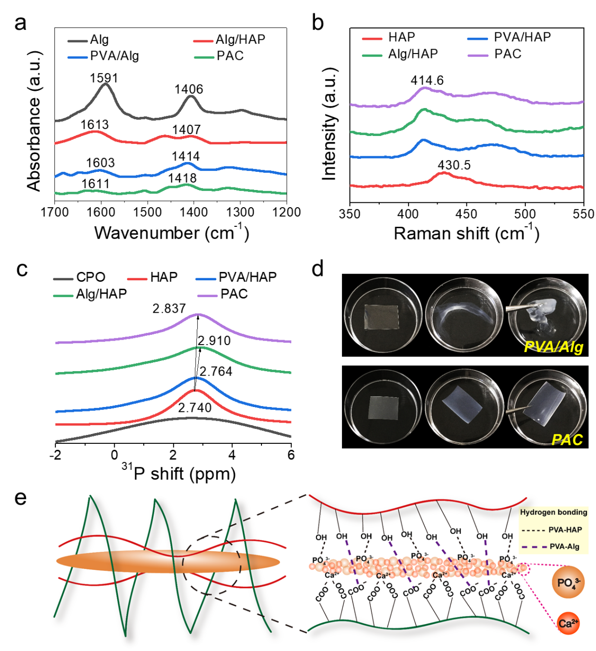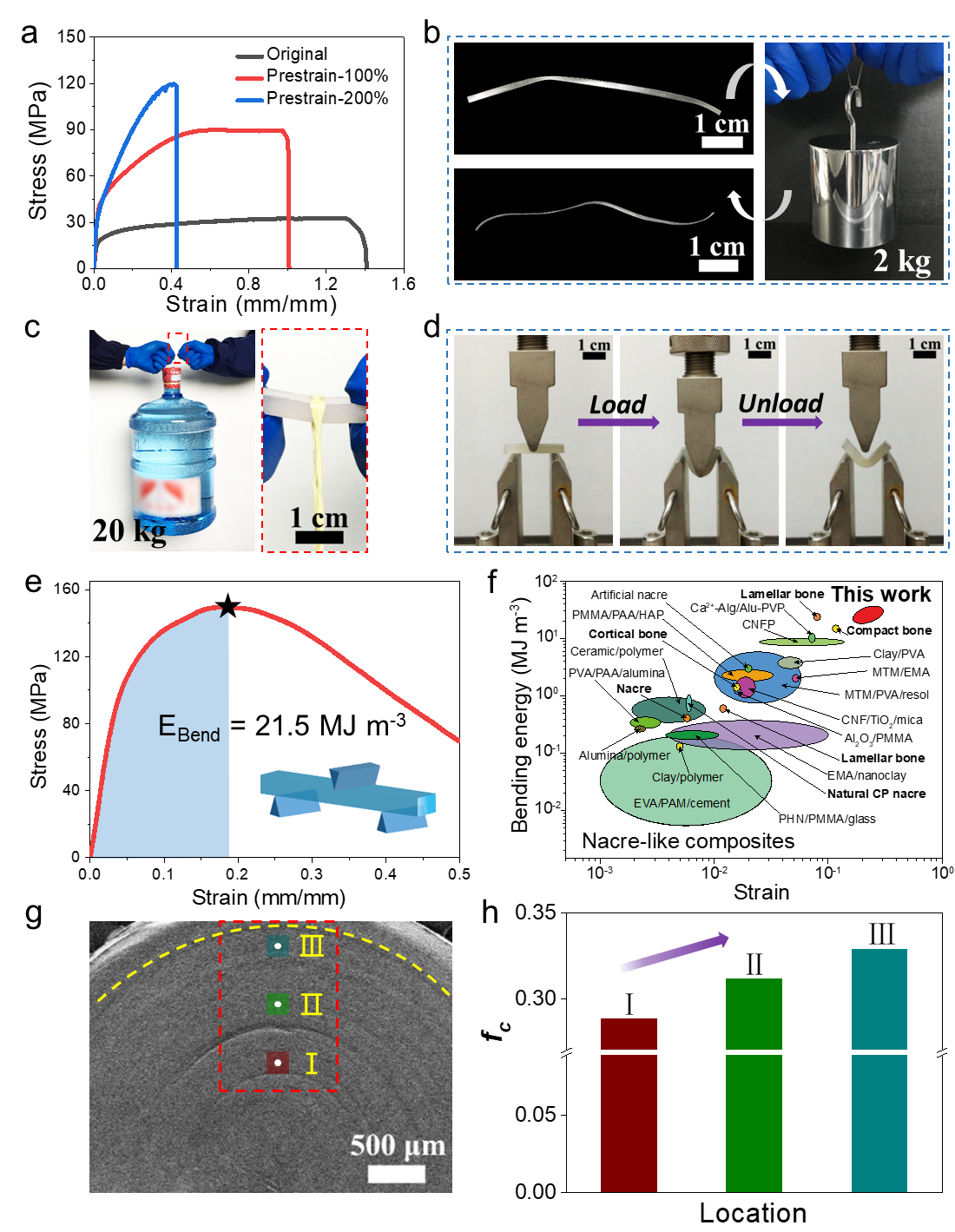 本工作中,受天然生物材料和上述研究成果的启发,团队通过简单的三步策略(组装-取向-交联),将粒径为1nm左右的磷酸钙离子寡聚体(CPO)整合到聚乙烯醇(PVA)和海藻酸钠(Alg)复合网络中,制备了一种超韧的仿生层状纳米复合材料。基于其在分子尺度上的多重相互作用(氢键和离子螯合)和多级层状有机-无机整合结构,所制备的层状复合材料具有超高的弯曲应变(> 50%无断裂)和弯曲韧性(21.5~31.0 MJ m-3),总体性能超过了天然贝壳和几乎所有的人工合成层状复合材料。此外,所制备的层状复合材料具有良好的抗冲击性能,可作为吸能材料。研究成果表明,提高超小无机构建单元和有机聚合物网络的集成程度,可以解决以往有机-无机复合材料构建过程中存在的相分离和界面缺陷问题,并显著提高其机械韧性。因此,这种基于无机离子寡聚体的三步合成策略为超韧层状材料的制备提供了一条新的途径。