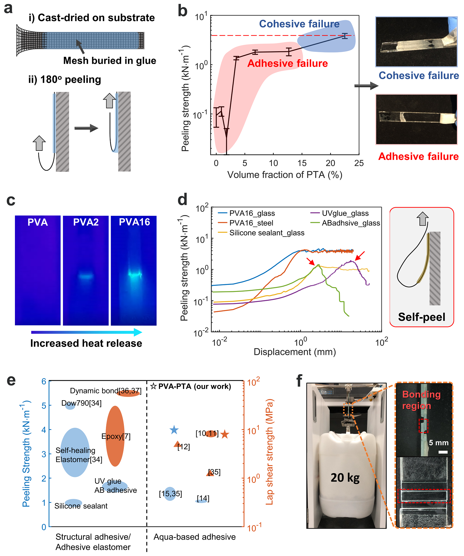 图3. a-d) PVA-PTA复合薄膜在不同表面(玻璃和金属)的180°剥离结果。e) PVA-PTA薄膜与近期报道的水性粘合剂、商用的结构胶和密封胶的对比。f) 胶水高粘结强的展示图。