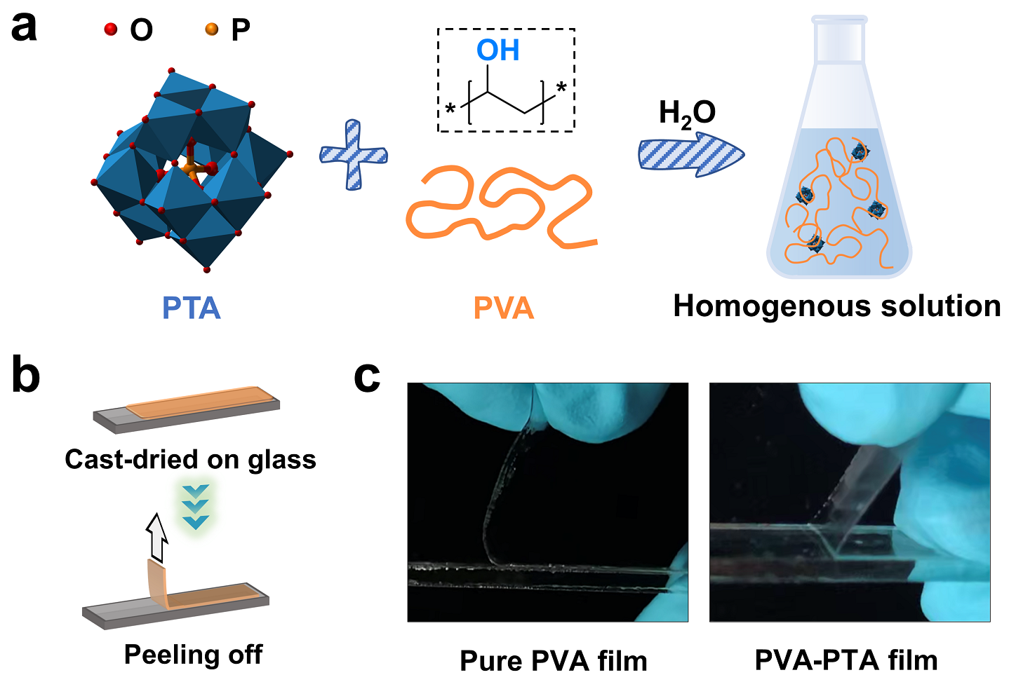 近日,华南理工大学殷盼超教授团队基于小角X射线散射(SAXS)系统研究聚合物团簇纳米复合材料构效关系,定向设计将1纳米磷钨酸(PTA)颗粒和PVA在水体系中共混,得到了稳定均质的水基型高强度粘合剂。PTA是一类具有亚纳米结构的金属氧化物团簇,具有超高的比表面积和高密度的表面氢键位点,为调控极性聚合物结晶提供了有效的方法。除此之外,此类分子簇价格便宜,具有电磁等物理、化学特性,可作为多功能复合材料设计(如催化剂和质子传输)的绝佳选择。
