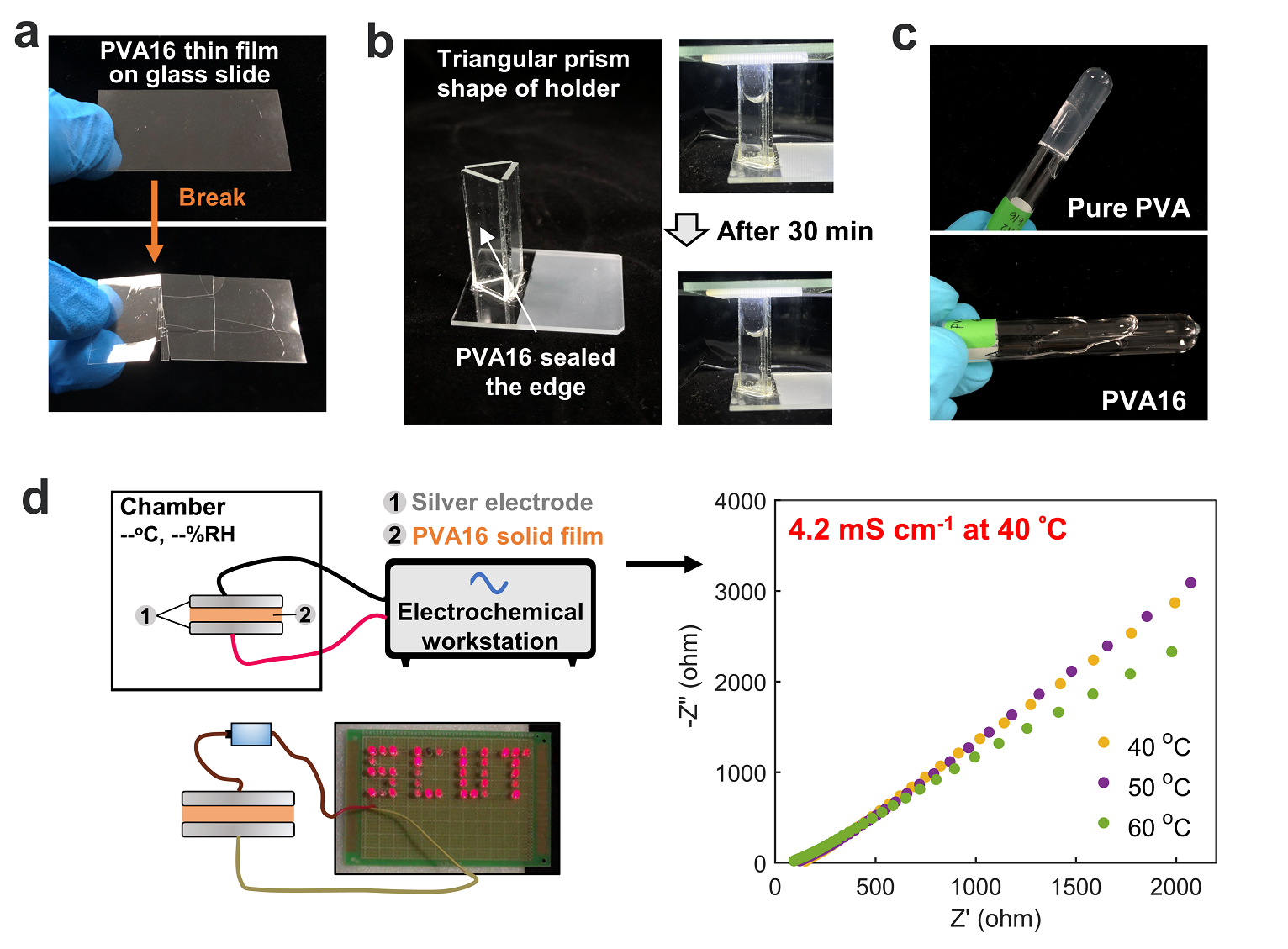 通过简单水溶液共混制得的PVA-PTA薄膜除了在极性表面有超高的粘接强度之外,PTA本身的特性也为该复合材料提供了其他功能。首先,薄膜具有高粘接强度和高透明性,可以作为安全玻璃的夹层。除此之外,该复合薄膜继承了PVA耐受有机溶剂的特性,实验人员使用粘合剂制成了一个自定义形状的玻璃比色皿,该比色皿可以用于盛放除了DMSO和水之外的有机溶剂,这比传统的烧结法更加方便和节能。另外,PVA-PTA复合薄膜具有较好的质子电导率(4.2 mS cm–1 at 40 °C),有望应用在电极粘合剂、燃料电池质子交换膜、和导电光学器件等领域上。