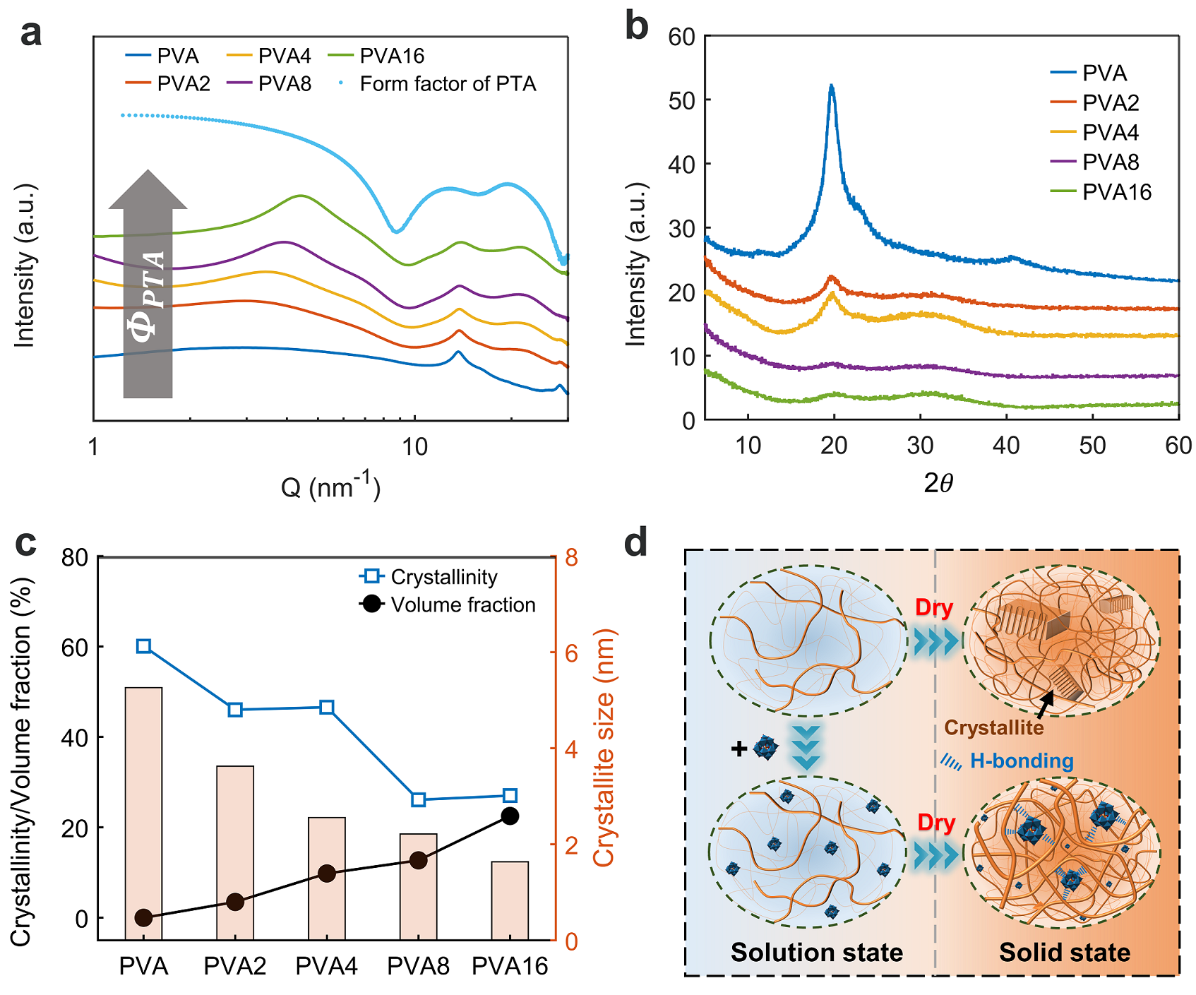 图2. PVA-PTA复合薄膜的结构表征,包括a) SAXS和b) XRD。c) 复合薄膜结晶度和晶粒尺寸受PTA体积分数的影响。d) PTA在PVA聚合物基质中的单分散性和氢键相互作用的示意图。