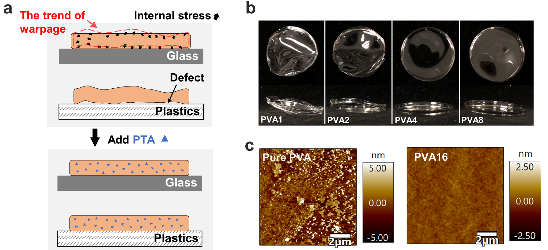 为了探究PTA的引入对聚合物残余应力的影响,研究人员将具有不同PTA体积分数的PVA水溶液在聚苯乙烯培养皿上干燥。因为聚苯乙烯和PVA之间的黏附性低,可以观察到残余应力使PVA薄膜从聚苯乙烯表面自动脱落。随着PTA体积分数的提高,可以观察到PVA因结晶产生的残余应力有显著的降低,其中含有约20% v/v PTA的薄膜不产生翘曲,可以几乎完美地贴合在干燥的聚苯乙烯基板上。除此之外,通过原子力显微镜可以观察到PTA对PVA薄膜界面结晶的影响。纯PVA薄膜表面拥有大量的片晶状结构,高度普遍在2到3纳米,这可能会造成PVA和玻璃表面无法紧密贴合。而加入约20% v/v PTA的PVA薄膜表面完全不存在片晶状结构,因此相对于纯PVA能够更好地填充粘接表面纳米级别的凹凸形貌,从而紧密贴合。综合上述两点,结合其本身优异的能量耗散能力,PVA-PTA复合薄膜在光滑玻璃表面展现了超高的剥离强度。
