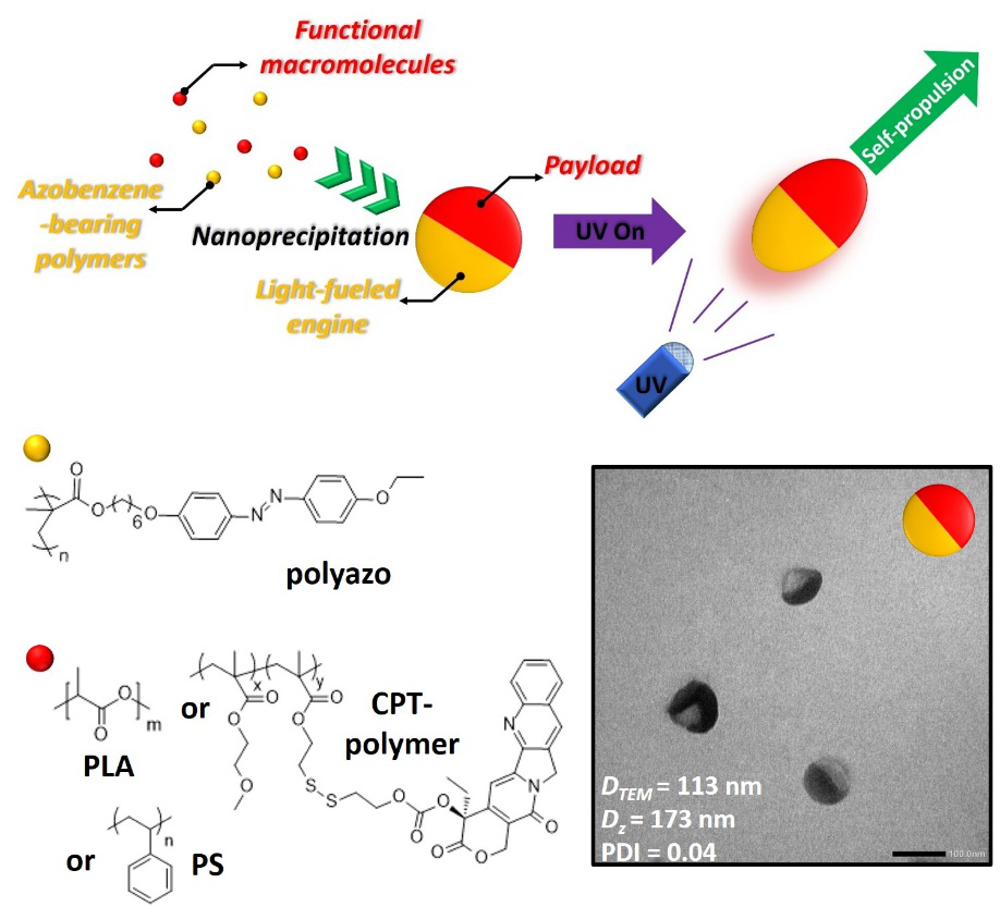光响应自推进高分子纳米马达,因高分子材料的生物相容性和光能的可远程无创穿透操作等优势,在生物医药领域受到了广泛的关注。然而,当前高分子在纳米马达中主要作为动力引擎的载体,马达运动主要由吸光重金属或光催化剂以不对称的方式负载于高分子纳米载体上以进行能量转换实现光热或光催化自推进。具有能量转换功能高分子引擎驱动的人造有机纳米马达的组装仍然具有极大的挑战。