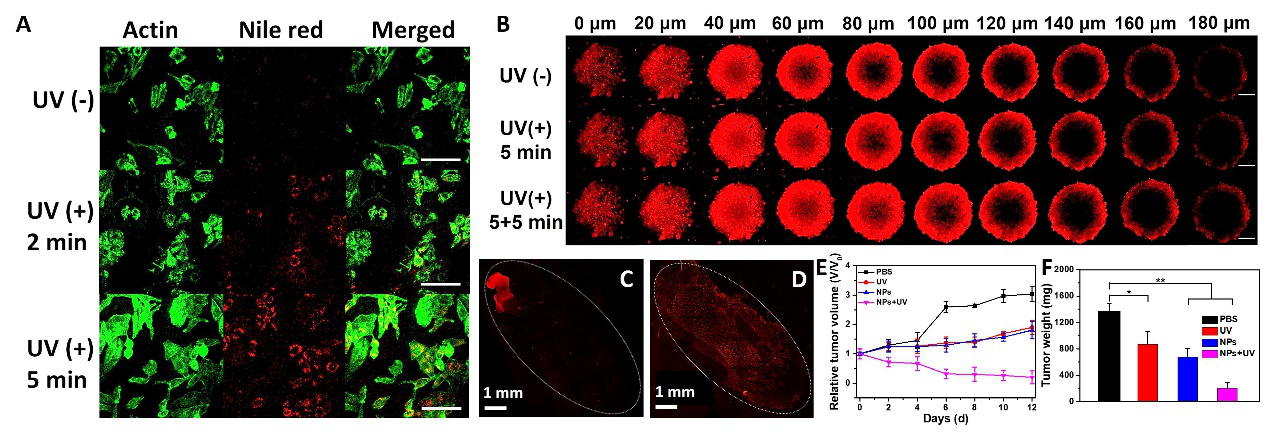 图3. 偶氮苯基聚合物引擎驱动光响应高分子纳米马达的体外(A:HepG2细胞和B:HepG2肿瘤细胞球)和体内(C-D:小鼠实体瘤,C为无光照处理对照)肿瘤微环境渗透能力和载药抗癌治疗潜力(E-F,喜树碱大分子抗癌活性物质为高分子载荷)评估