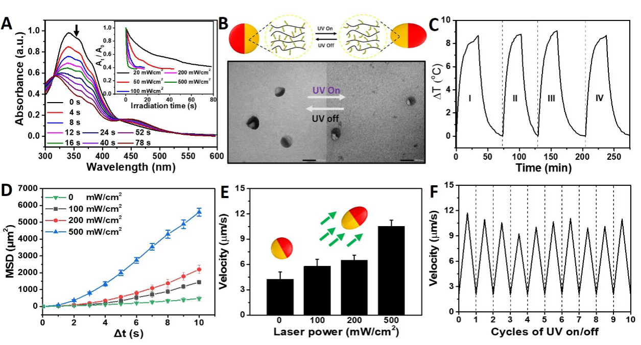 图2. 偶氮苯基聚合物引擎驱动光响应高分子纳米马达的光响应性质表征(A-C)和自推进运动表征(D-F)