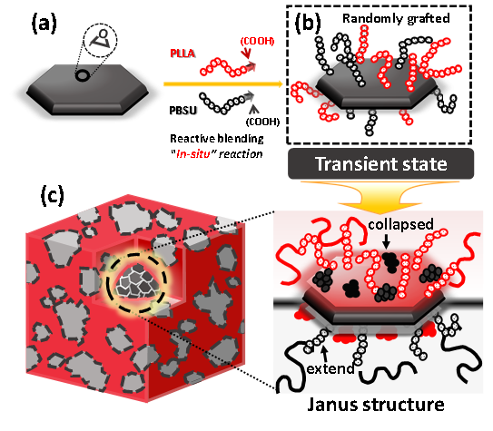 无机纳米粒子增容不相容高分子不但可以提高组分相间的界面粘接,提高材料的力学性能,而且能赋予材料功能特性,受到广泛关注。作为增容剂的无机纳米粒子通常应当具有两面(Janus)结构,才能热力学稳定地处于界面,并分别与两组分分子链缠结(或特殊相互作用)实现相间的界面增强。使用二维纳米片做增容剂时,人们往往需要预先精确地在纳米片两面分别修饰上不同的基团或分子链,获得Janus型结构,从而实现增容,提高力学性能。然而纳米片两面的分别修饰过程复杂,合成条件苛刻,难度大,实际应用受到巨大限制。