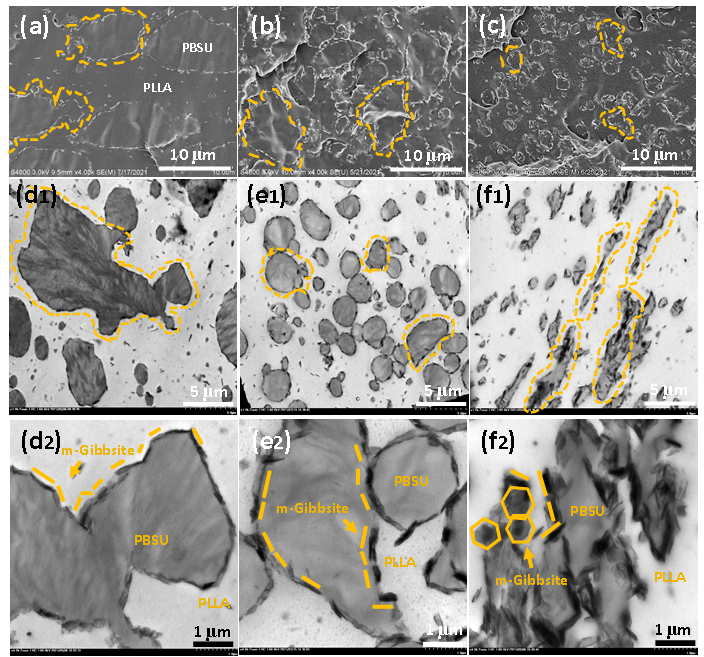 将共混物中的纳米片提取后发现,共混过程中纳米片表面上同时接枝有PLLA链和PBSU链,且PLLA和PBSU分子链的接枝率接近为1:1(图2),证明在共混过程中,PLLA和PBSU的端羧基与纳米片表面修饰的环氧基团发生原位接枝反应。