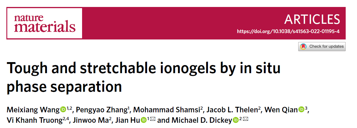 鉴于此,西安交通大学胡建教授联合北卡罗来纳州立大学Michael Dickey教授提出了一种基于原位相分离的简单通用设计原理,通过一步法快速无规共聚使溶解性质迥异的两种聚合物组分在离子液体中原位形成双连续相分离结构,实现了离子液体凝胶强度(12.6 MPa)、韧性(24 kJ/m2)、模量(46.5 MPa)和可拉伸性(600%)的同时提升以及自恢复、自愈合、形状记忆、抗溶胀和可3D打印等功能集成,并从相分离结构角度揭示了高力学性能和多功能性的工作机制。原位相分离技术适用于各种常见的单体和离子液体,且不需要传统相分离技术所必需的繁琐后处理操作(如溶剂交换、热处理、外力诱导等),有助于相关研究人员方便地制备高力学性能离子液体凝胶并拓展其应用空间。该研究以“Tough and stretchable ionogels by in situ phase separation”为题发表在最新一期《Nature Materials》上。论文第一作者为王美香博士,西安交通大学胡建教授和北卡罗来纳州立大学Michael Dickey教授为共同通讯作者。论文第一单位为西安交通大学机械结构强度与振动国家重点实验室软机器实验室。