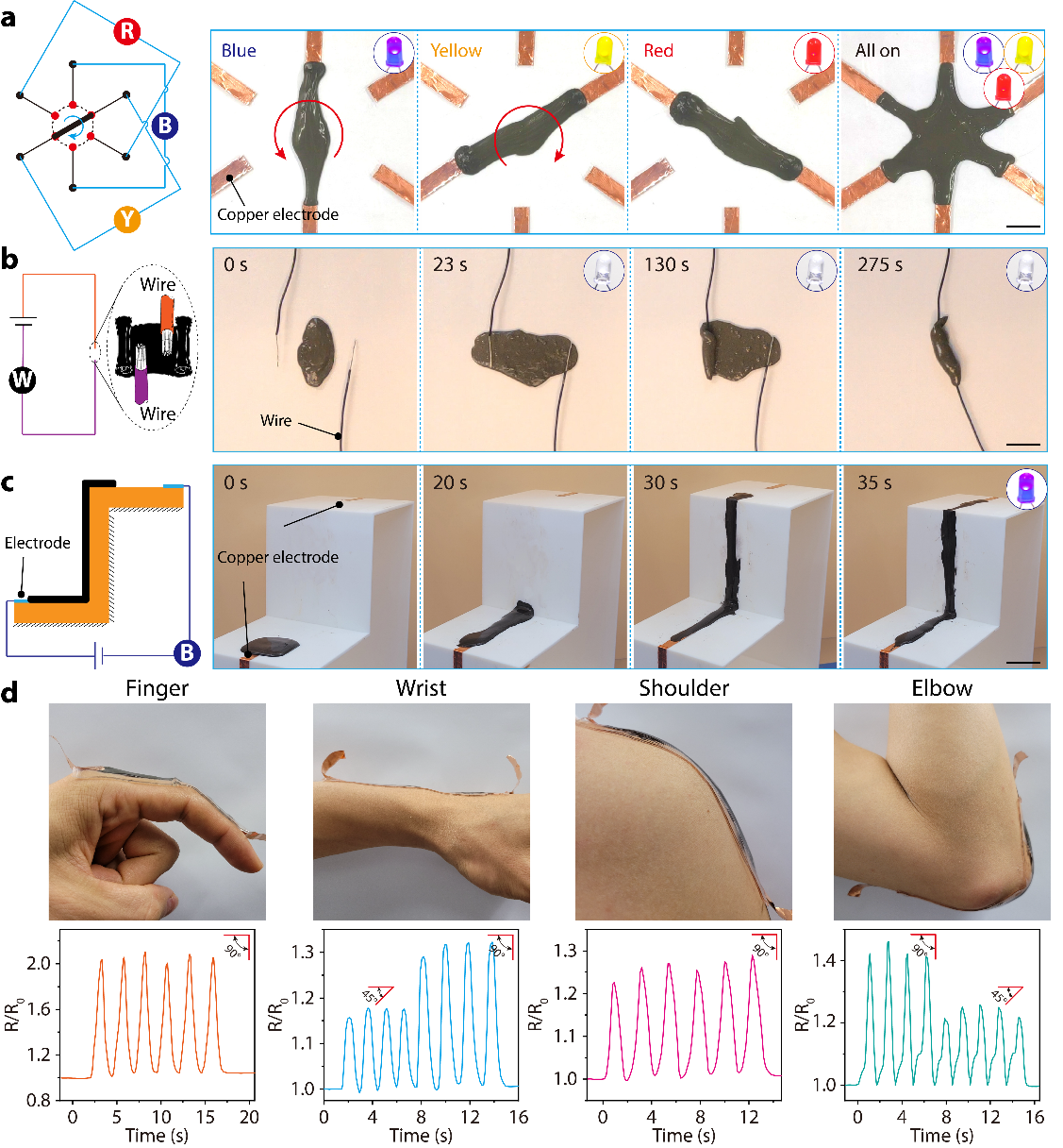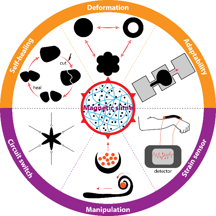 鉴于此,香港中文大学张立教授团队、哈尔滨工业大学谢晖教授团队报道了一种磁驱动“史莱姆”软体机器人,它既具有基于磁性弹性体的机器人的环境适应性,又具有基于磁性流体的机器人的极端变形能力。磁性“史莱姆”是一种非牛顿流体水凝胶,具有粘弹性,在很长一段时间内表现为粘性液体,但在短时间内表现为弹性固体。而“史莱姆”机器人可以轻松通过直径为 1.5 毫米的狭窄通道,并在气体、液体环境中的多种基底上进行可控运动(图1)。这种磁驱动“史莱姆”机器人具备多种功能,例如可以通过卷曲或胞吞模式进行物体捕获操纵(图2),以及利用自己的导电特性进行电路修复和切换控制,甚至可以重新配置为用于监测人体运动的应变传感器(图3)。这项研究工作提出了新型软体机器人的设计方案,所提出的磁性“史莱姆”机器人具有极强的环境适应性,而且兼具可变形、可重构、自愈和导电的特性,使其在生物医学和可穿戴设备中的应用中前景广阔。该工作以“Reconfigurable Magnetic Slime Robot: Deformation, Adaptability, and Multifunction”为题发表在《Advanced Functional Materials》。文章第一作者是香港中文大学博士后孙猛猛博士,香港中文大学张立教授和哈尔滨工业大学谢晖教授为论文的共同通讯作者。