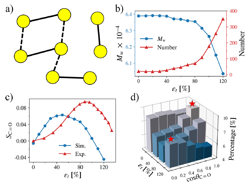 本研究中,基于本课题组前期创建的聚脲全原子/粗粒化杂化模型(Mol. Simul. 2021, 47, 1258),结合DPD和MC模拟方法构建了具有微相分离结构的聚脲模拟体系,并进行了单轴拉伸的非平衡态分子动力学模拟(图 1)。模拟得到的拉伸曲线与实验结果吻合,复现了聚脲的非线性力学响应特征(图 2)。通过对微相结构的表征,发现在未拉伸时软硬域为双连续结构;硬域在40%应变后开始断裂;在80%应变后演化为硬域为岛相的海岛结构。在拉伸初期,形成有序氢键的羰基倾向于沿拉伸方向取向,而在后期转为垂直于拉伸方向取向,并对拉伸样品进行了原位偏振红外实验表征,证明了模拟与实验结果的一致性(图 3)。通过对链段末端距分布统计,发现软段末端距由单峰分布分裂为双峰分布。上述微观结构的演化过程揭示了聚脲韧性的两种分子机制:硬段的取向自增强机制和软段的应力适应性释放机制(图4)。