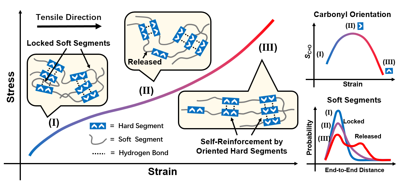 图 4. 聚脲拉伸过程中的微观结构演化和增韧的分子机制