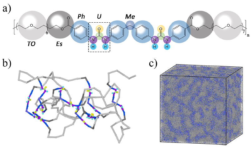 聚脲是一类软硬嵌段交替连接构成的高分子材料。由于热力学不相容性,软段和硬段倾向于各自聚集,形成纳米尺度微相分离结构。硬段中脲基间存在氢键相互作用,导致了分子间动力学耦合。由于特殊的微观结构,聚脲在单轴拉伸中表现出优异的韧性。近年来,研究者们基于聚脲结构开发了很多的超韧性材料(Adv. Mater. 2021, 33, 2101498;Adv. Mater. 2021, 33, 2008523)。然而,尽管研究证实聚脲的微观结构对其力学性能具有决定性影响作用,但是受限于实验精度,拉伸过程聚脲微观结构(包括微相结构和氢键结构)的演化过程仍未明确。揭示聚脲高韧性背后的分子机制对高韧性材料的分子设计具有重要意义。