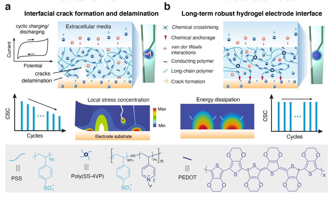 稳定高效的神经接口是诊断和治疗各种神经紊乱/疾病的最有效途径之一,如癫痫,帕金森,阿尔茨海默症等。导电聚合物具有优异的电学/电化学性质及生物兼容性,例如PEDOT:PSS聚合物或水凝胶,被认可为综合性能优异的神经界面材料。然而,在潮湿的生理环境中,导电聚合物与电极之间的界面稳定性差;尤其是在长期的电刺激过程中,PEDOT:PSS涂层会发生持续的体积膨胀/收缩,导致聚合物/水凝胶涂层内部和界面的裂纹产生、涂层脱落等结构破坏,电化学性能急剧降低,脑部疤痕形成和炎症反应,极大地限制了神经诊断和治疗的实用性和可靠性,为生物电子在脑机接口领域的广泛应用提出了重大挑战。