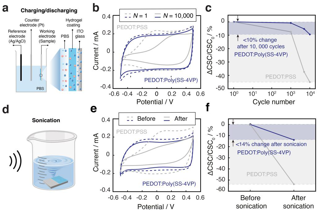 图2. PEDOT:Poly(SS-4VP)水凝胶电极涂层的电化学和机械稳定性。
