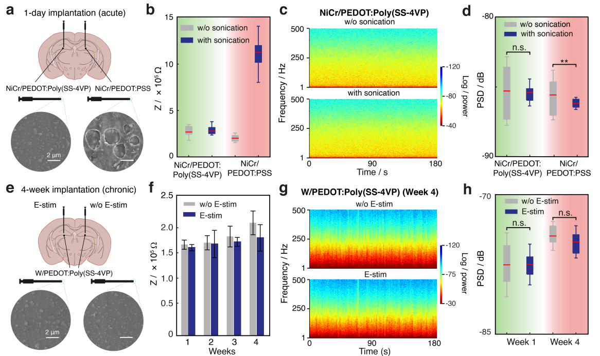 该团队通过这类具有PEDOT:Poly(SS-4VP)水凝胶涂层的生物电极植入到小鼠海马区,在长达4周的电生理记录过程中,导电聚合物水凝胶/电极界面稳定,且在1 kHz下的阻抗值始终低于250 kΩ,确保高分辨率的电生理记录(图3)。综上所示,这类导电水凝胶涂层的构筑策略为高性能神经界面的构建、新一代脑机接口技术的开发,如神经类疾病的电生理记录和生物电子疗法等,提供了技术支撑。