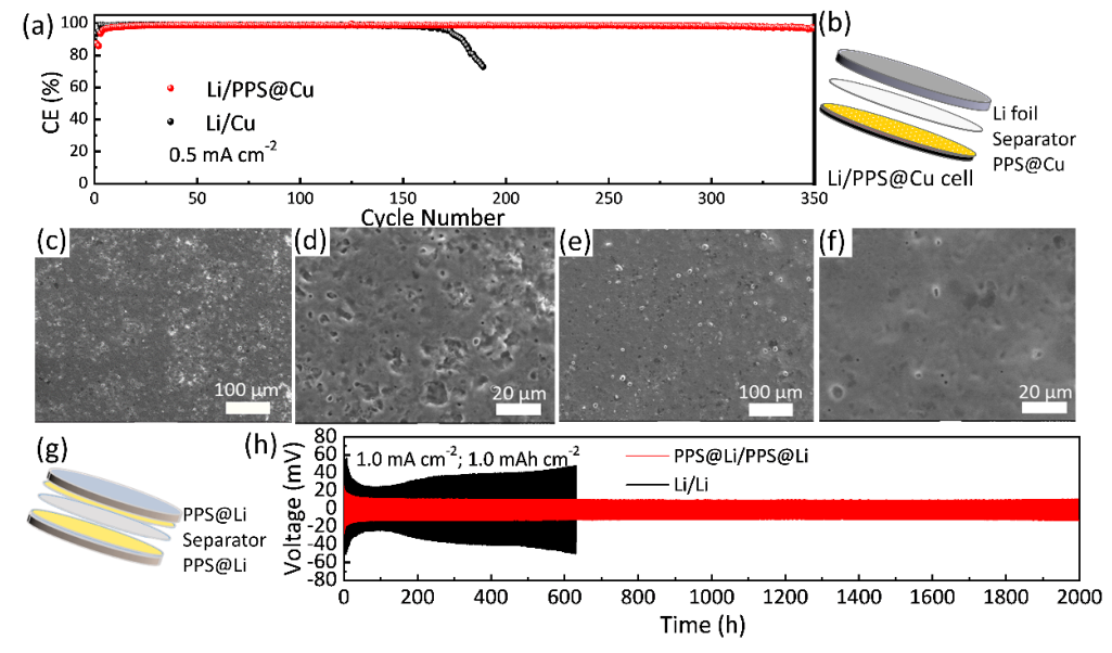 图2.半电池和对称电池的表面形貌和电化学性能。(a)电流密度为0.5 mA cm-2时Li/PPS@Cu和Li/Cu电池的CEs,插图为Li/PPS@Cu半电池结构图示。(b)Li/PPS@Cu电池示意图。(c)裸露铜箔的SEM图像。(e)PPS@Cu箔的SEM图像。(d)和(f)分别是(c)和(e)的放大扫描电子显微镜图像。(g)PPS@Li/PPS@Li电池示意图。(h)PPS@Li/PPS@Li和Li/Li电池在1.0 mA cm-2时的循环性能。