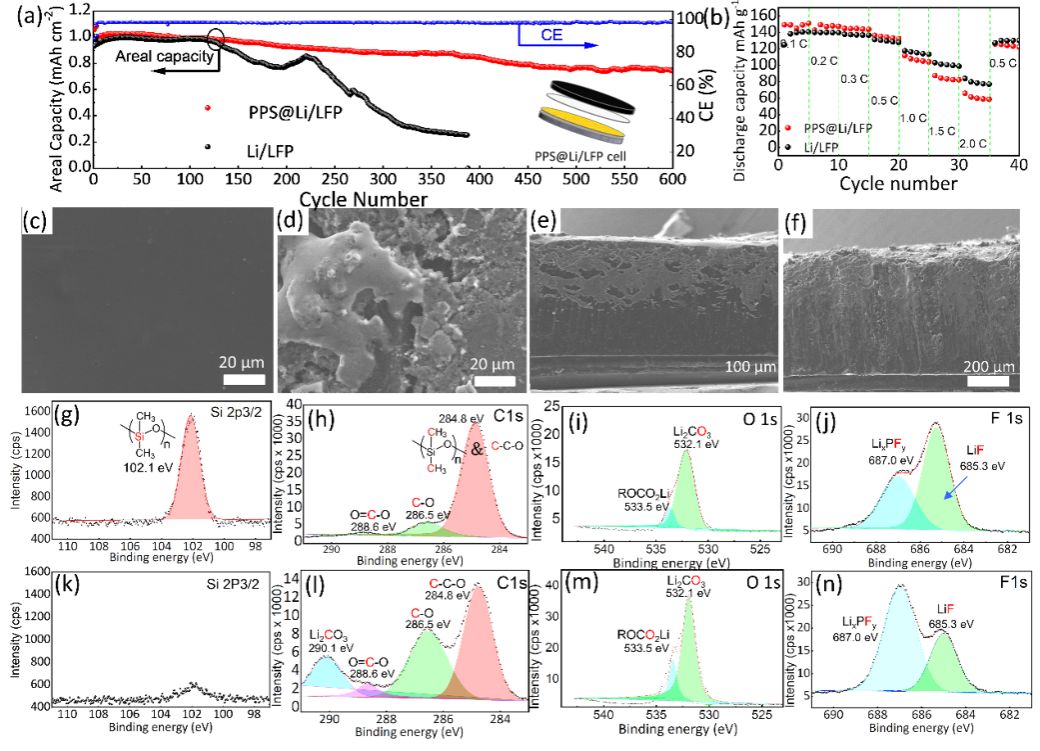 图3.电池的电化学性能和锂电极的表面分析。(a)PPS@Li/LFP和Li/LFP电池在电流密度为1C时的循环性能。(b)PPS@Li/LFP和Li/PPS电池的倍率性能测试。(c)和(d)分别是以LFP为正极的PPS@Li和裸Li电极在50次循环后的SEM图像。(e)和(f)分别是以LFP为正极的PPS@Li和裸Li电极在50次循环后的横截面SEM图像。(g-n) PPS@Li和裸Li电极的XPS光谱:(g) PPS@Li电极的Si 2p3/2, (h) C 1s, (i) O 1s 和 (j) F 1s光谱;(k) 裸Li电极的Si 2p3/2, (l) C 1s, (m) O 1s 和 (n) F 1s光谱。